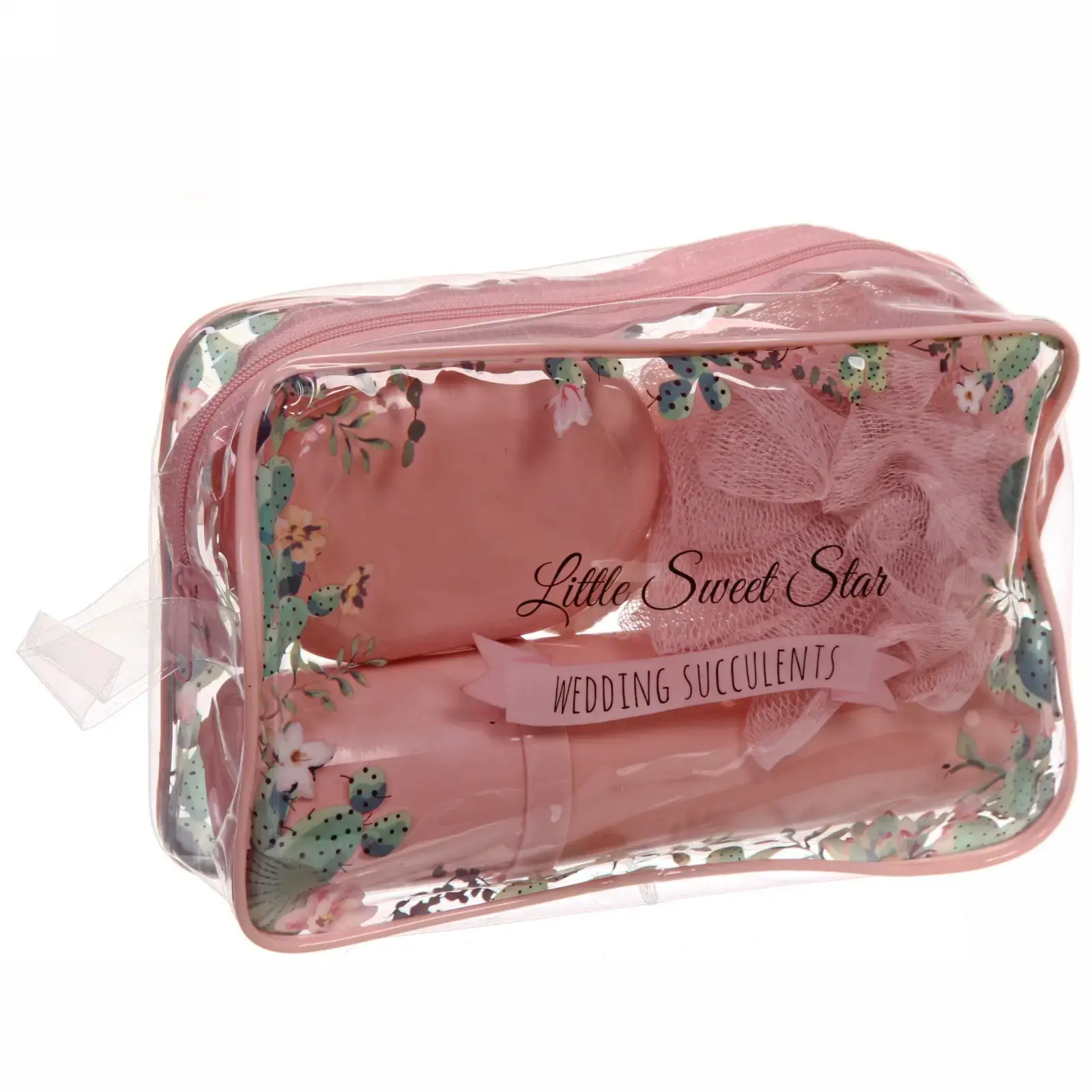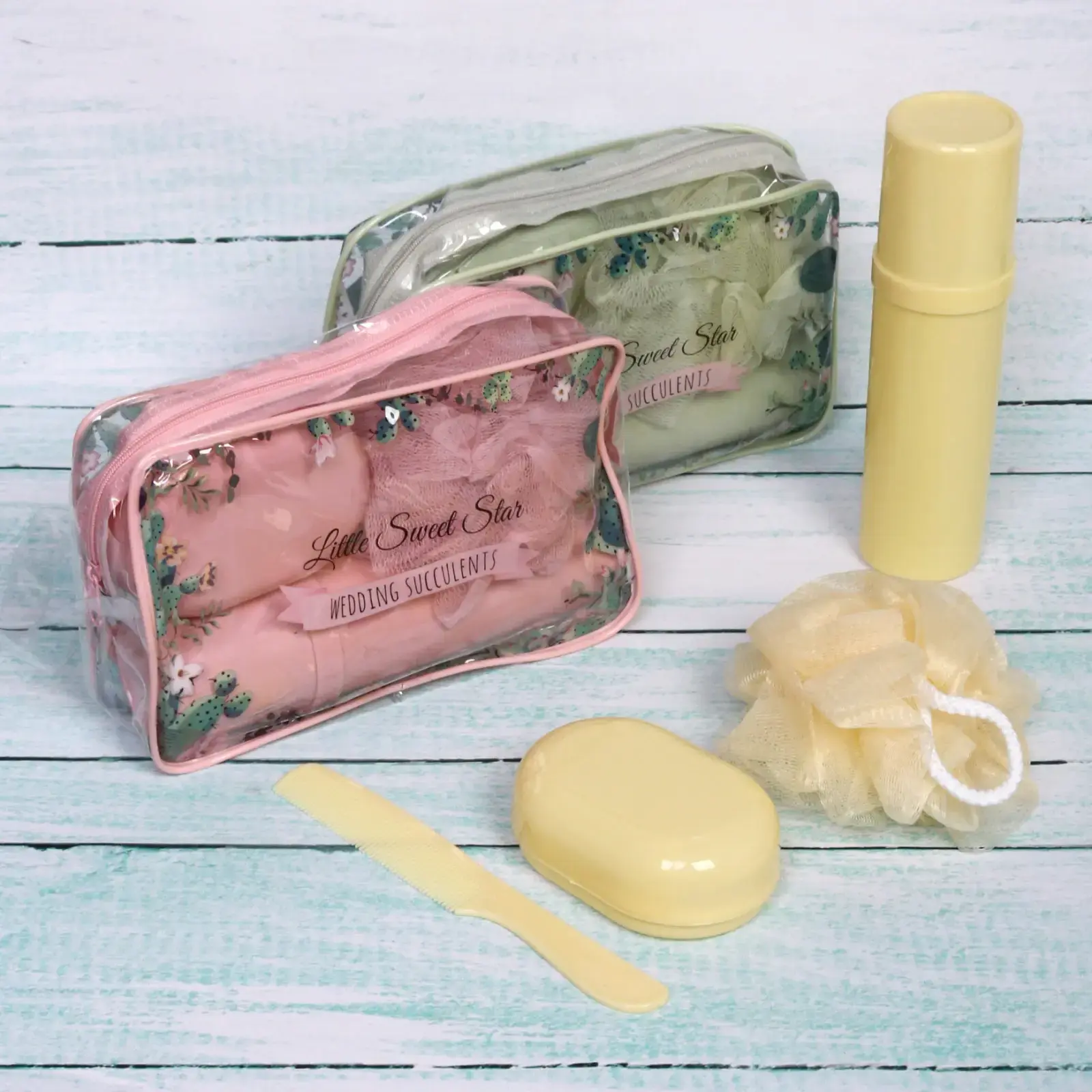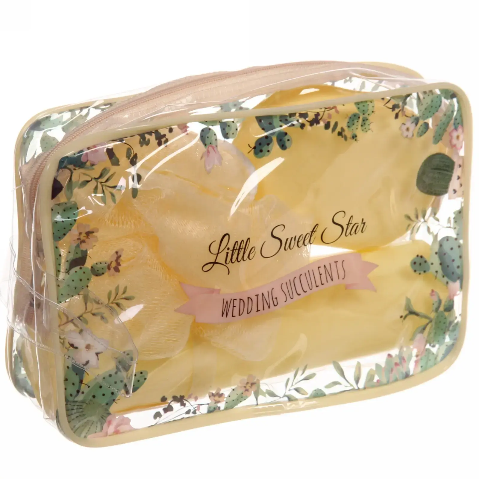 В состав набора входят мочалка-сетка, футляр для зубной щётки и пасты, закрытая мыльница, классическая расчёска и прозрачная косметичка с оригинальным дизайном. Все предметы выполнены из лёгкого и безопасного пластика, что обеспечивает их долговечность и практичность. Косметичка достаточно вместительная, чтобы уместить дополнительные принадлежности, такие как косметика и средства для ухода за телом.