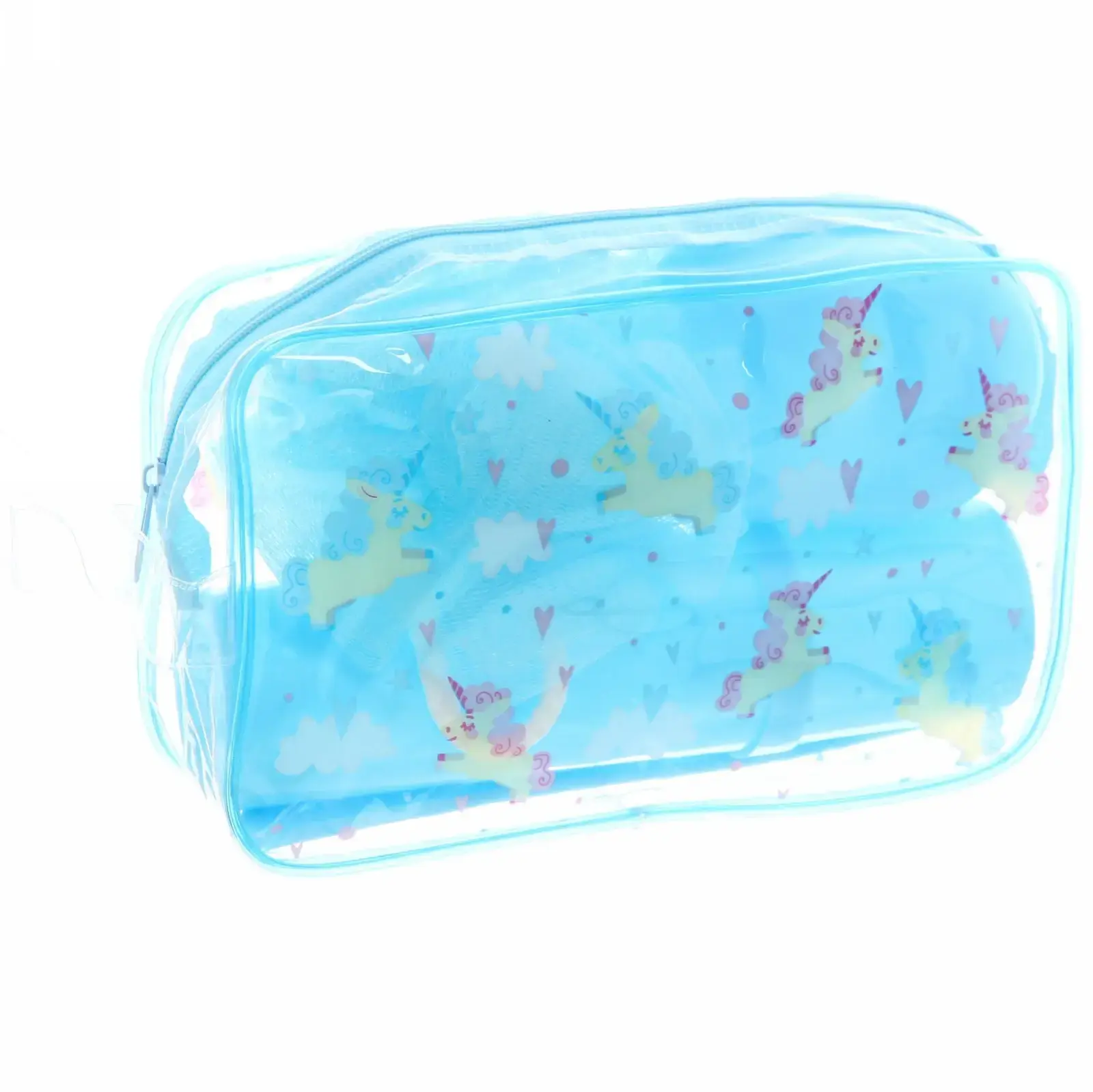 Размеры предметов в наборе: мочалка — диаметр 10 см, футляр — 19х5 см, мыльница — 10х6х3,5 см, расчёска — 18х2,5 см, косметичка — 20х15х6 см. Все изделия выполнены в голубом цвете с яркими рисунками единорогов, что добавляет нотку веселья и оригинальности.