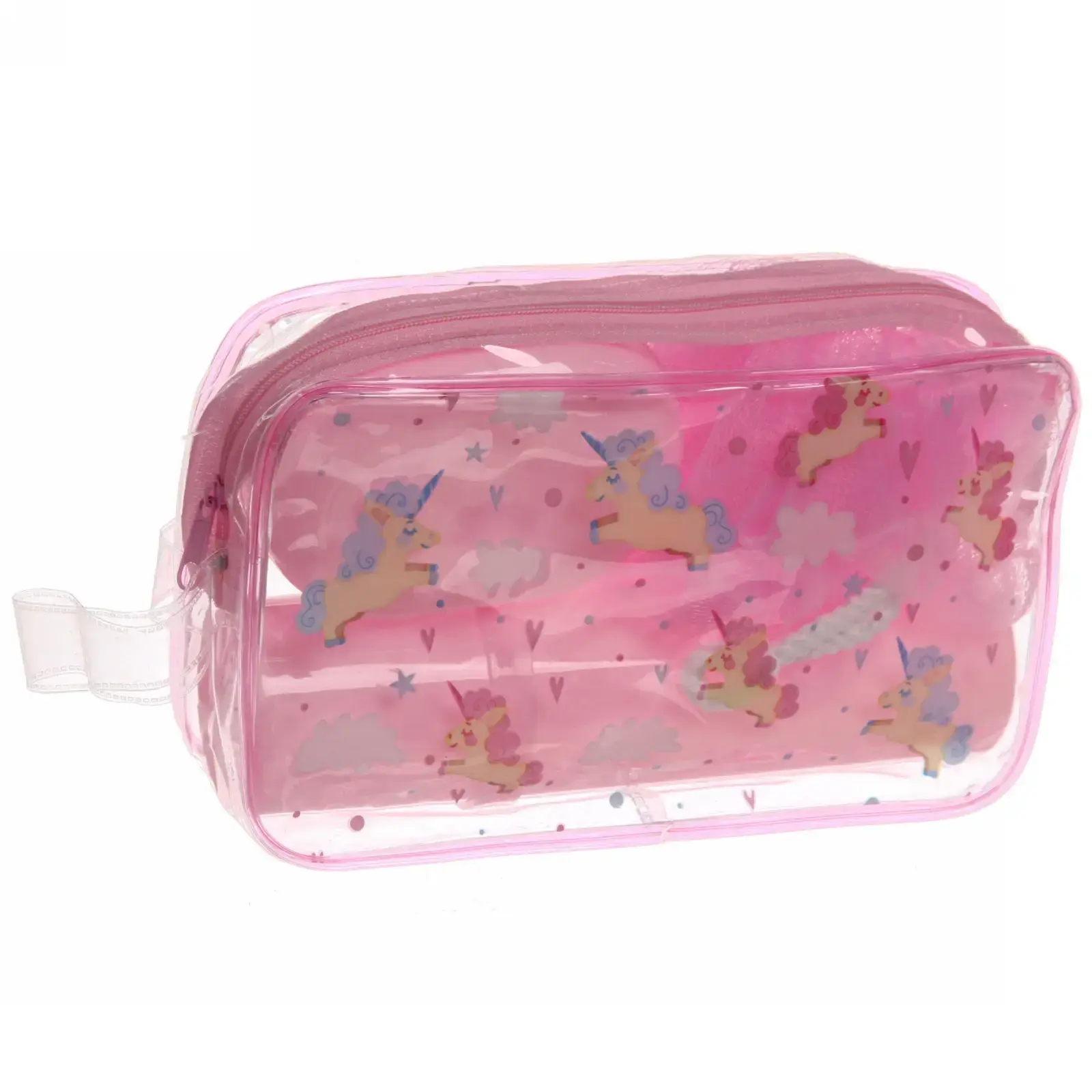 Косметичка из прочного ПВХ с двойной молнией защитит содержимое от влаги и повреждений. Яркий принт с единорогами поднимет настроение, а прозрачные стенки экономят время на поиски. Все предметы выполнены из безопасного пластика без резкого запаха.