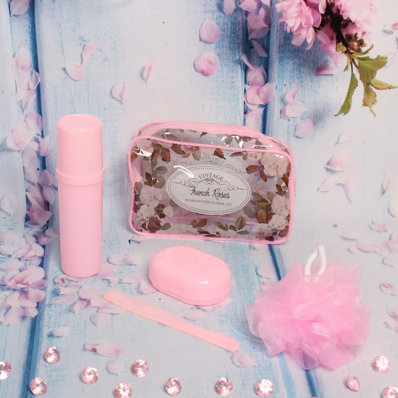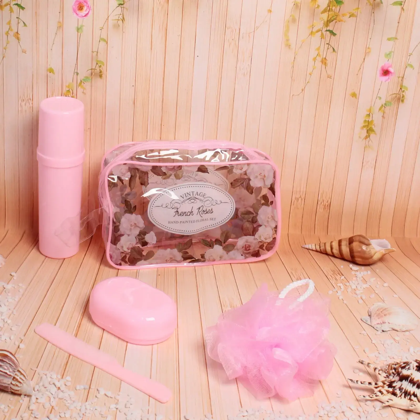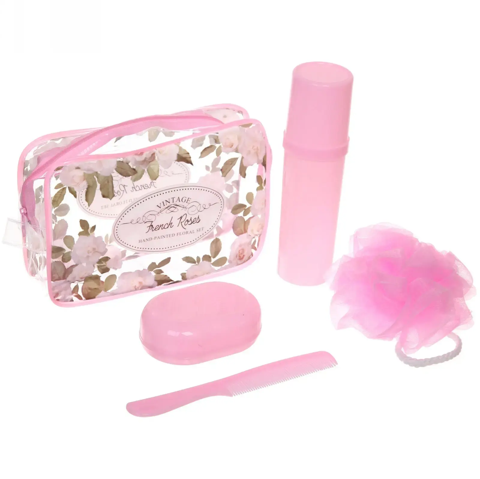 Размеры предметов в наборе: мочалка — диаметр 10 см, футляр — 19х5 см, мыльница — 10х6х3,5 см, расчёска — 18х2,5 см, косметичка — 20х15х6 см. Этот набор станет вашим верным спутником в любых поездках, обеспечивая комфорт и стиль.
