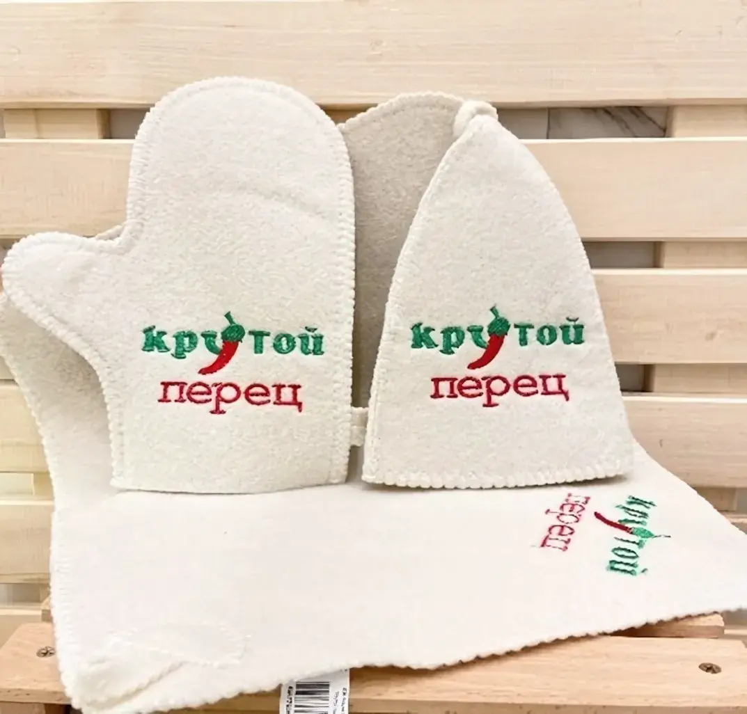 Набор из трех войлочных аксессуаров с тематической вышивкой создан для ценителей комфорта и атмосферы русской бани. Эргономичная шапка защитит от перегрева, удобная варежка поможет сделать массаж веником, а плотный коврик обеспечит гигиеничность процедур.