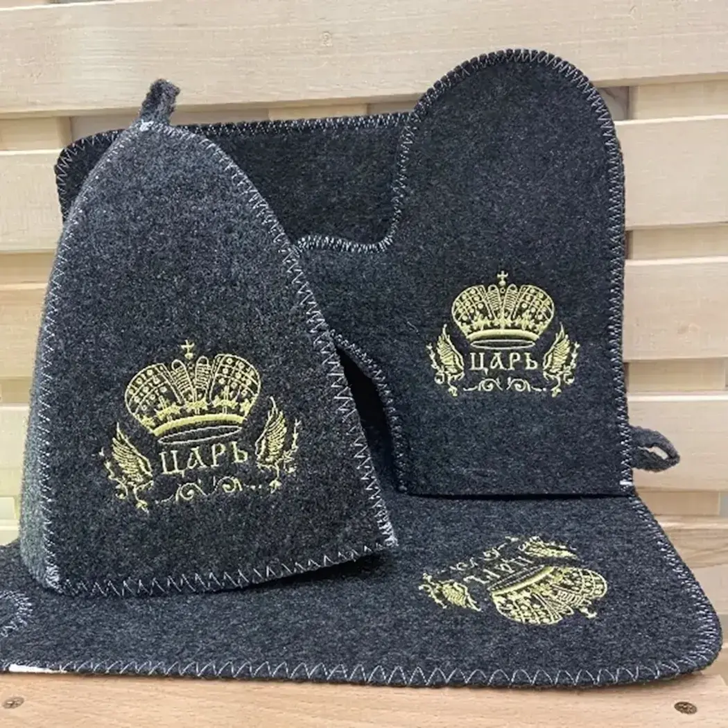 Набор банный 'Классика', 3 предмета, серый, шерсть/полиэфир, вышивка 'Царь'