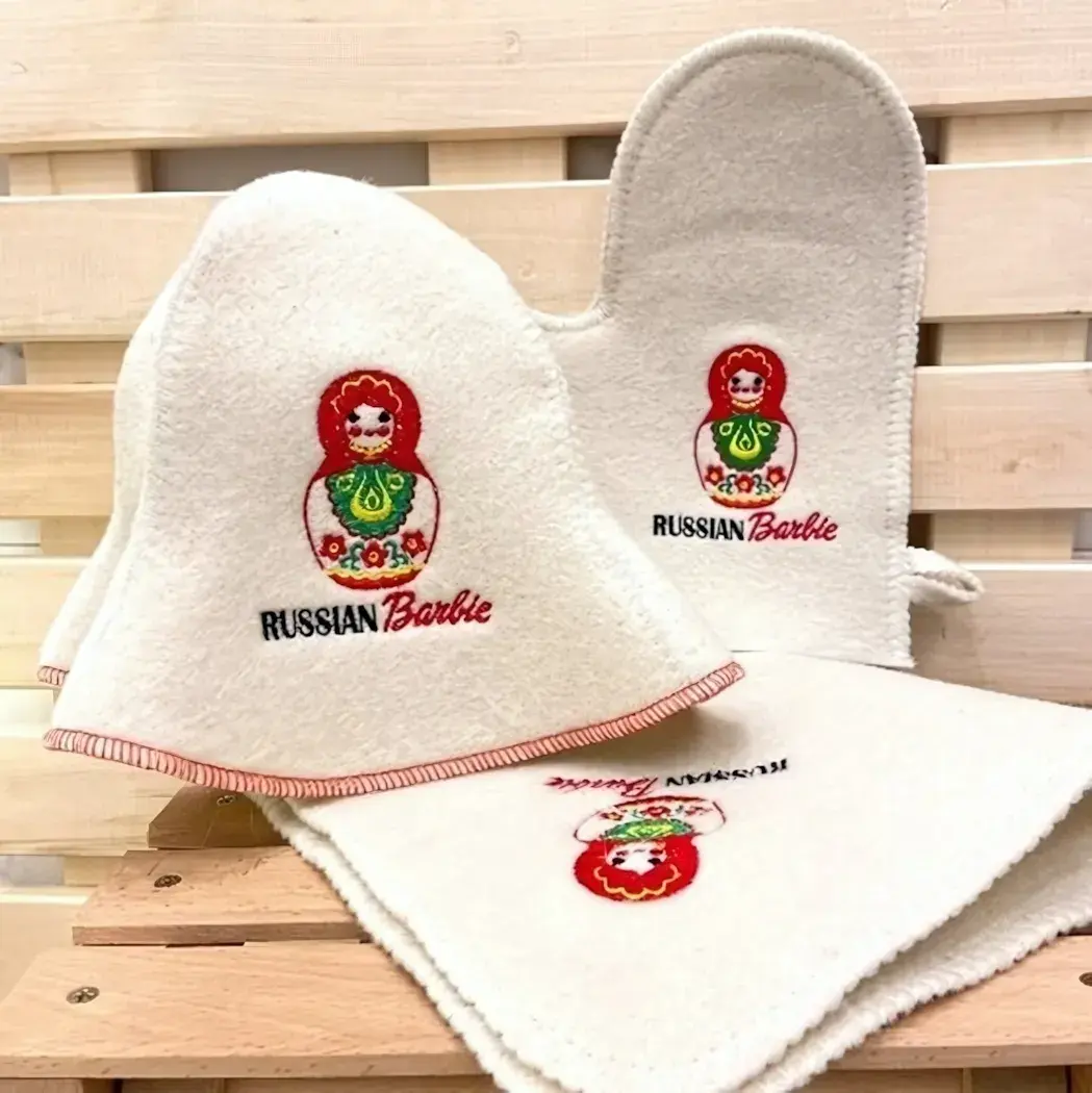 Этот набор банных аксессуаров создан для тех, кто ценит комфорт и оригинальный дизайн в бане или сауне. Традиционный войлок сочетается с игривым принтом 'Russian Barbie'.