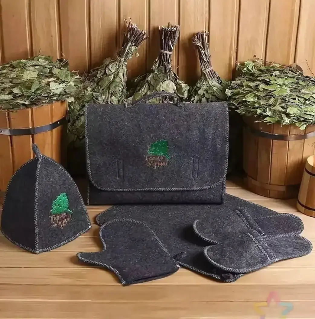 Набор станет отличным подарком для любителей бани или сауны. Все элементы изготовлены из качественного войлока, обеспечивающего теплоизоляцию и комфорт при использовании.