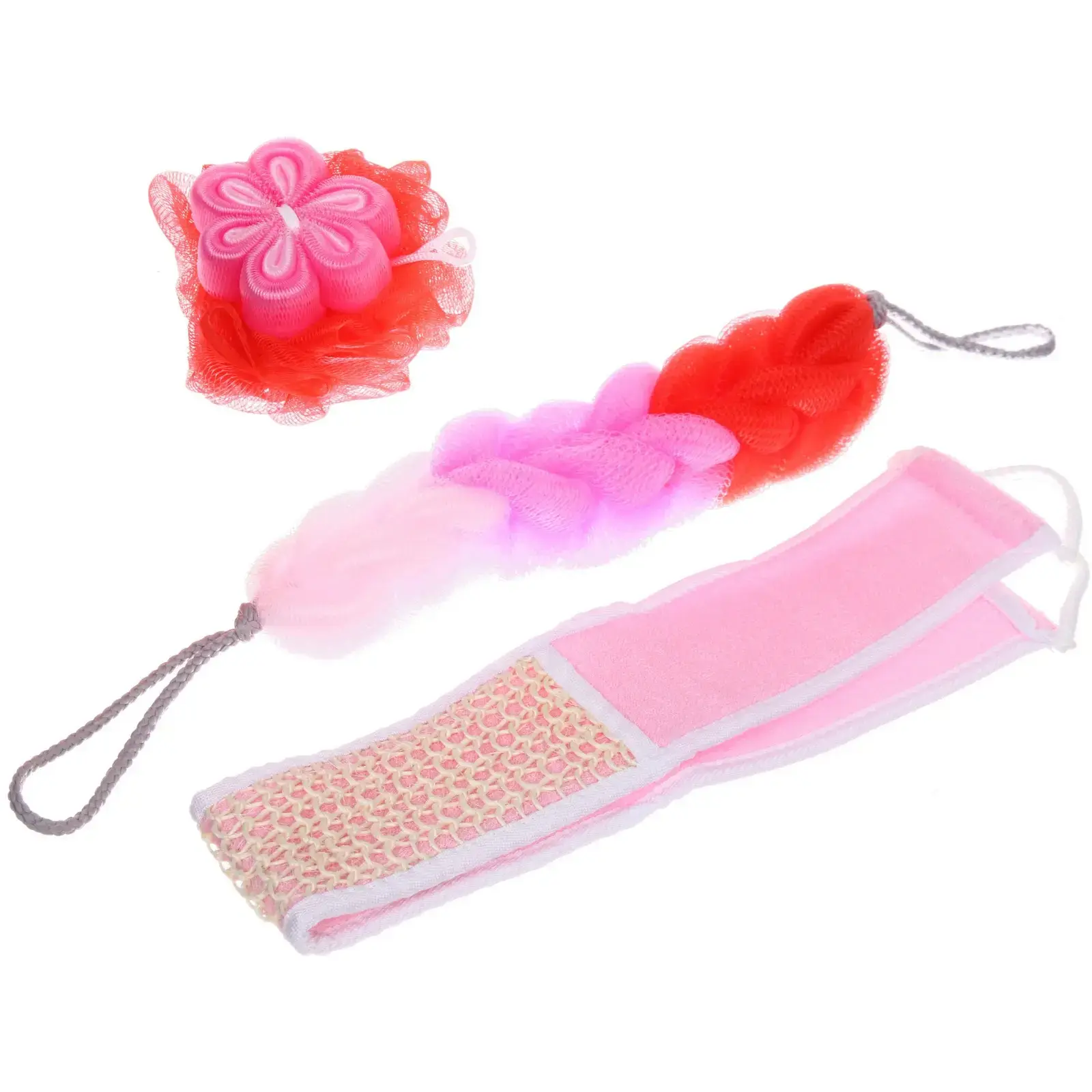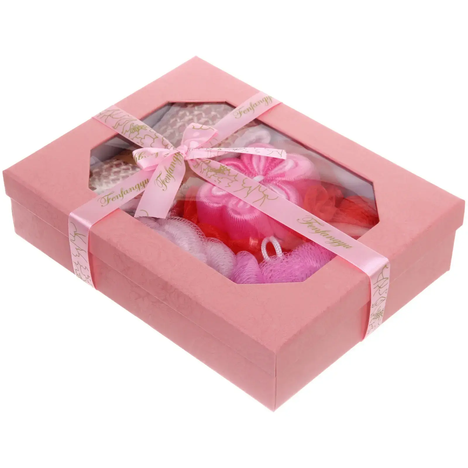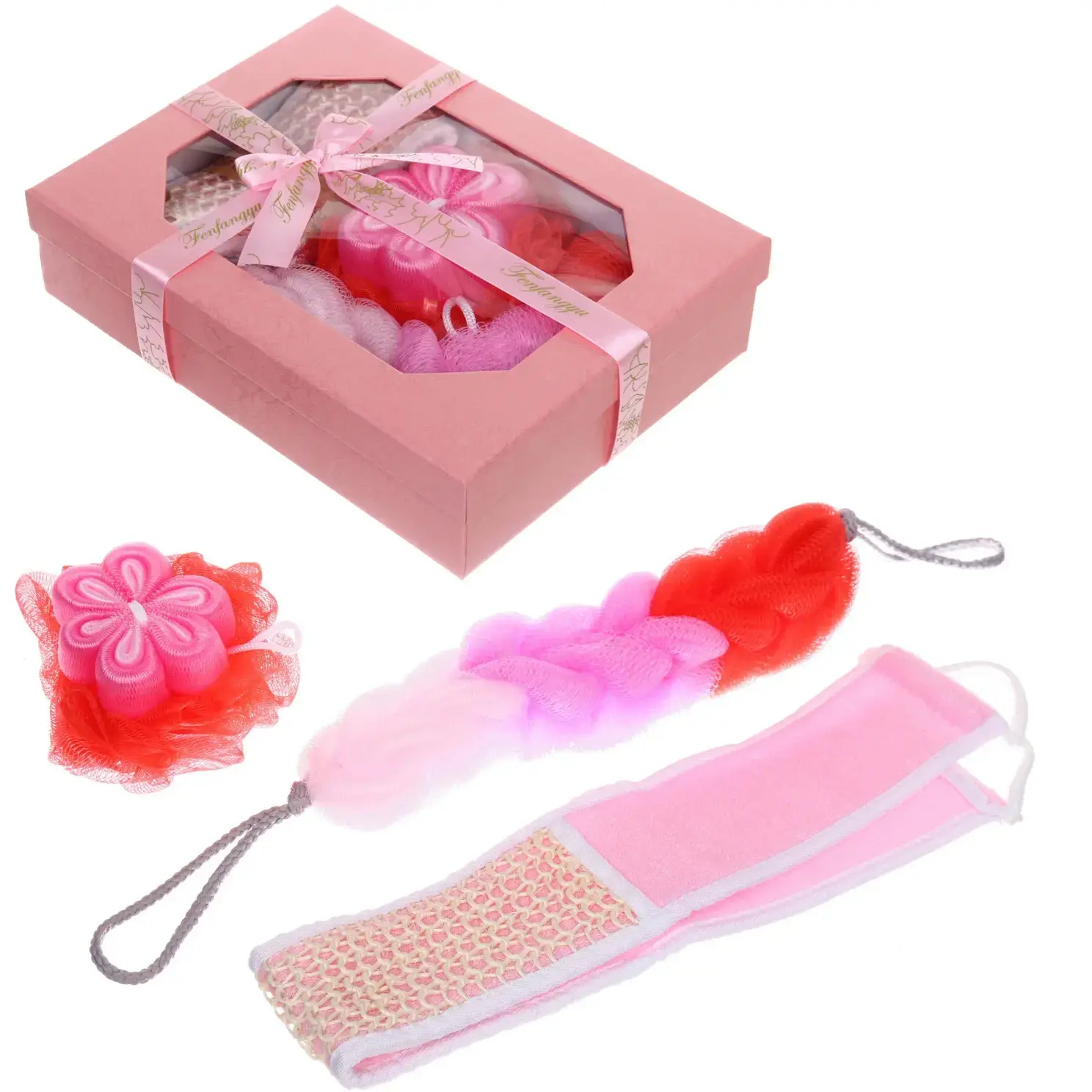 Набор включает в себя три мочалки, каждая из которых имеет уникальный дизайн и текстуру. Они выполнены из качественного текстиля и полипропилена, что обеспечивает долговечность и комфорт при использовании. Подарочная упаковка в светло-розовом цвете с прозрачной частью и бантом добавляет элегантности и делает набор отличным подарком для любого случая.