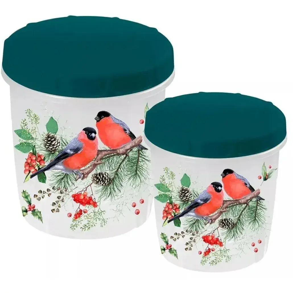 Набор из двух практичных контейнеров сохранит сыпучие продукты, специи и готовые блюда свежими. Узор с зимними птицами добавит уюта вашей кухне, а прозрачные стенки позволяют быстро найти нужное содержимое.