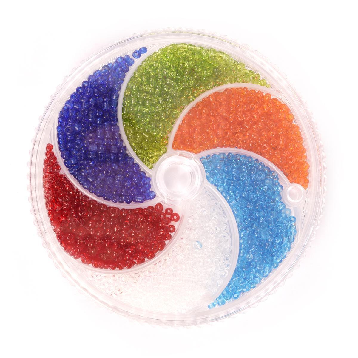 Контейнер с бусинами выполнен из прозрачного пластика и имеет круглую форму, что делает его удобным для хранения и использования. Каждая цветная секция разделена перегородками, что предотвращает смешивание цветов и позволяет поддерживать порядок. Размер бусин 11/0 делает их идеальными для создания мелких деталей в ваших проектах.