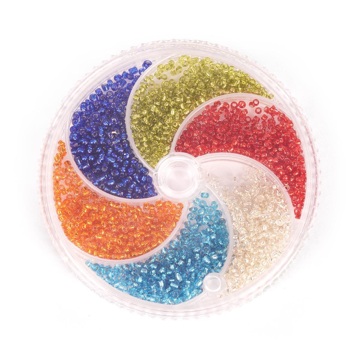 Бисер изготовлен из качественного стекла с гладкой поверхностью, что обеспечивает комфортную работу и равномерное переливание цвета. Контейнер имеет продуманную конструкцию с центральным отсеком для дополнительных материалов.