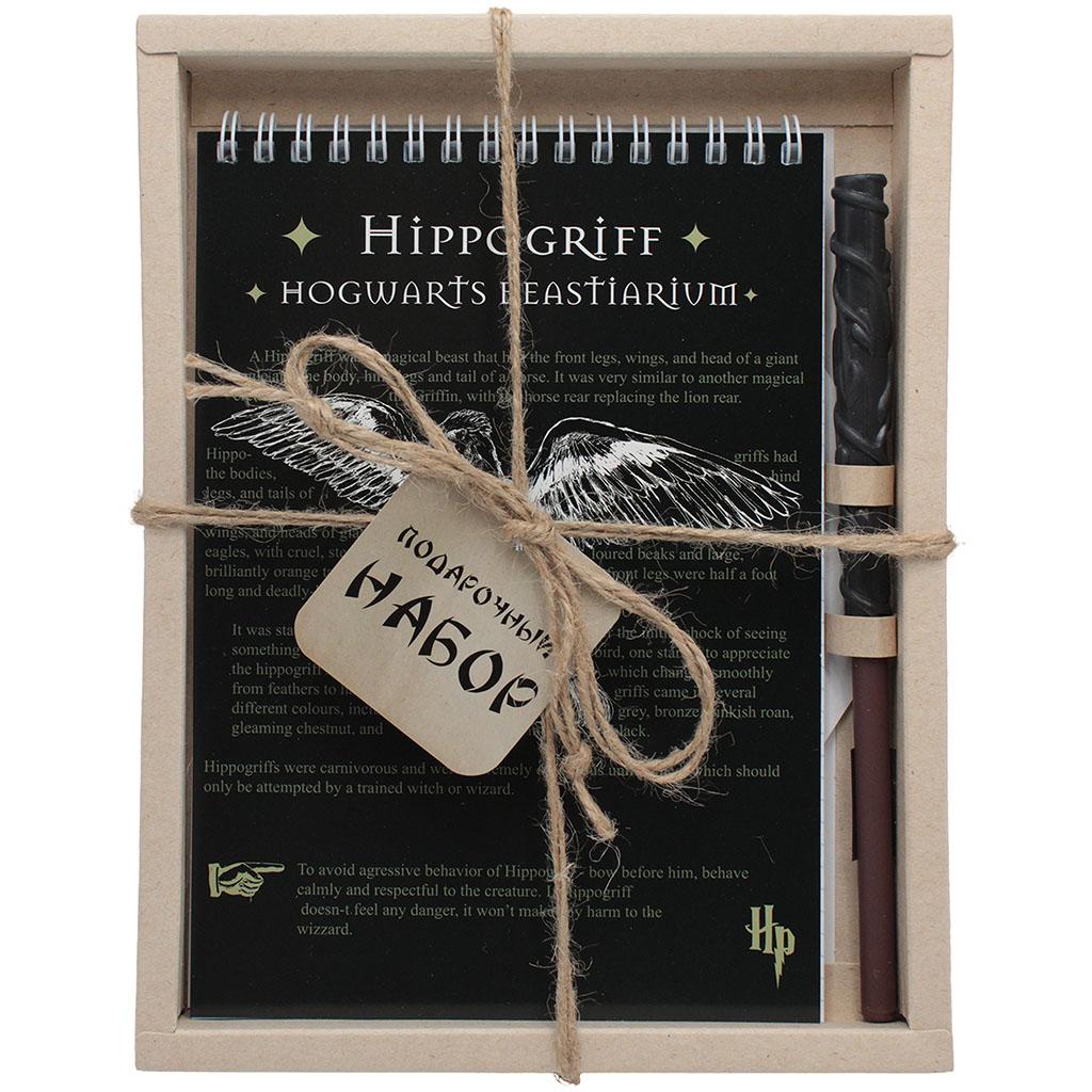 Центральное место в наборе занимает стильный блокнот формата А5. Обложка выполнена в глубоком черном цвете с контрастным белым принтом, посвященным гиппогрифу. Дизайн стилизован под страницы древнего бестиария: на обложке размещены детальные иллюстрации крыльев и текст на английском языке, описывающий повадки этого величественного существа. Блокнот содержит 60 листов и скреплен прочной металлической спиралью по верхней кромке, что позволяет удобно переворачивать страницы и делать записи на весу.