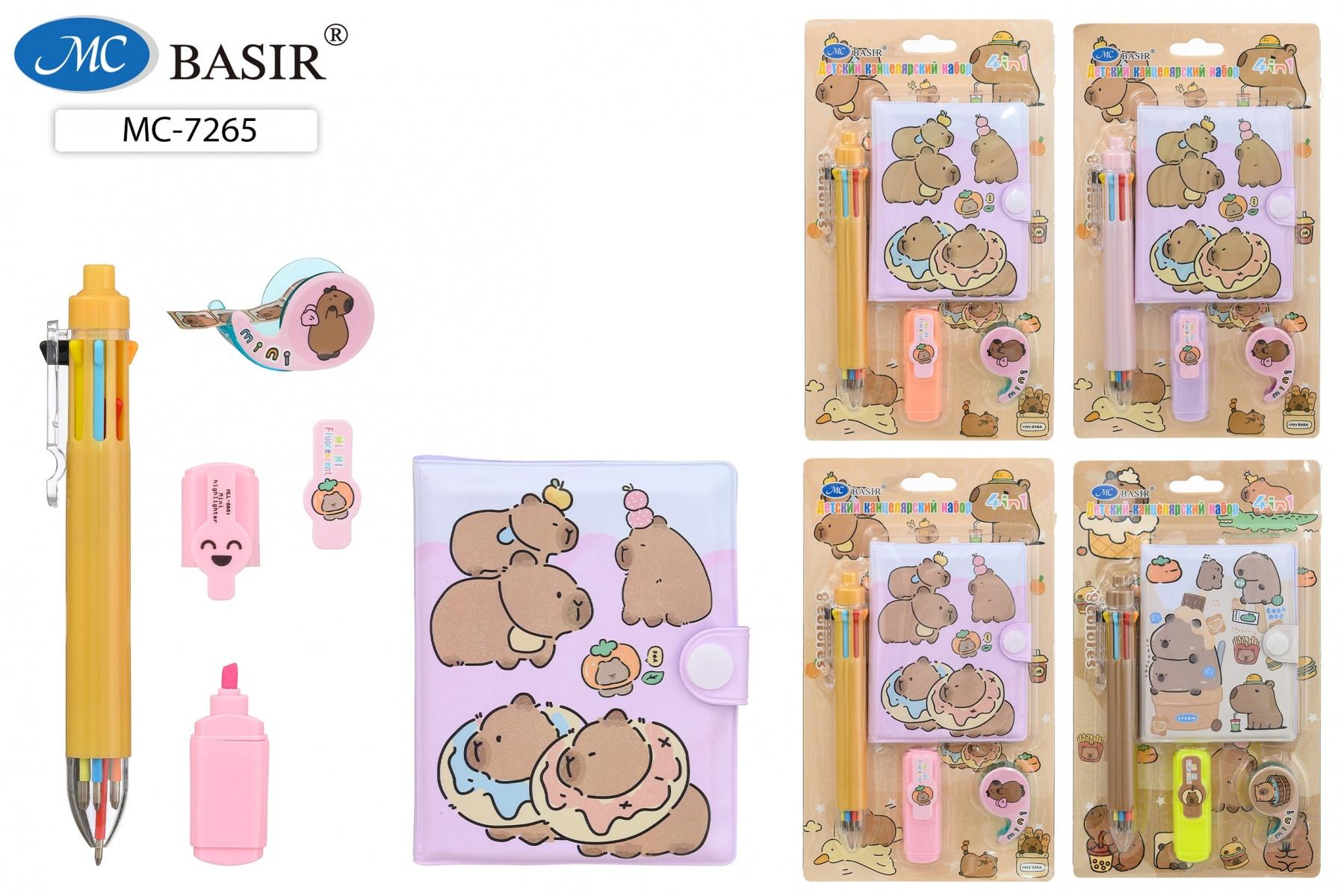 Набор канцелярский "Капибара" 4 в 1: блокнот 10,3*8см, ручка 8 цветов, маркер, скотч