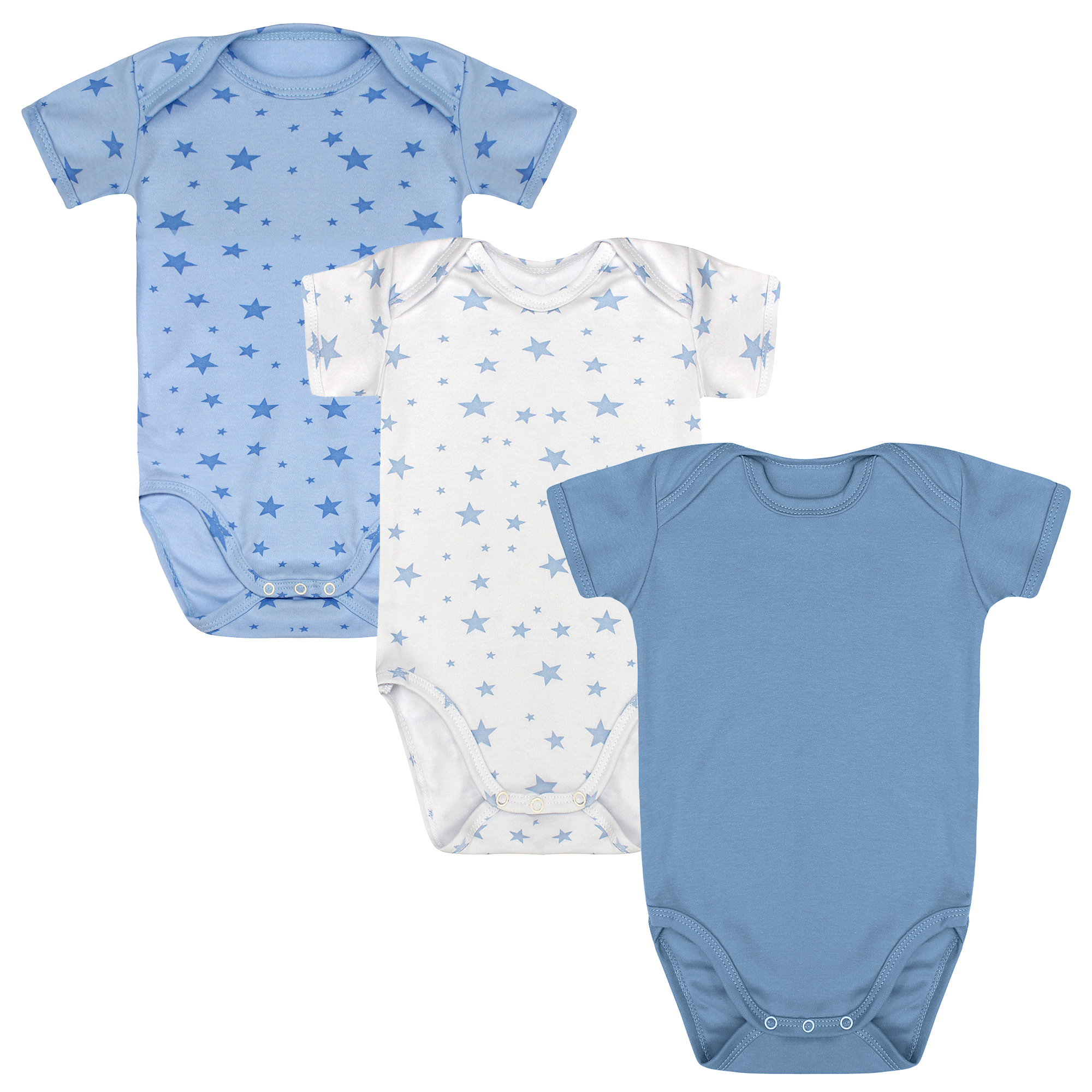 Боди выполнены в спокойных голубых тонах с аккуратными принтами, которые не выцветают после стирки. Разнообразие расцветок (однотонный светло-голубой, белый со звездами и темно-голубой) позволяет комбинировать их с различной одеждой.