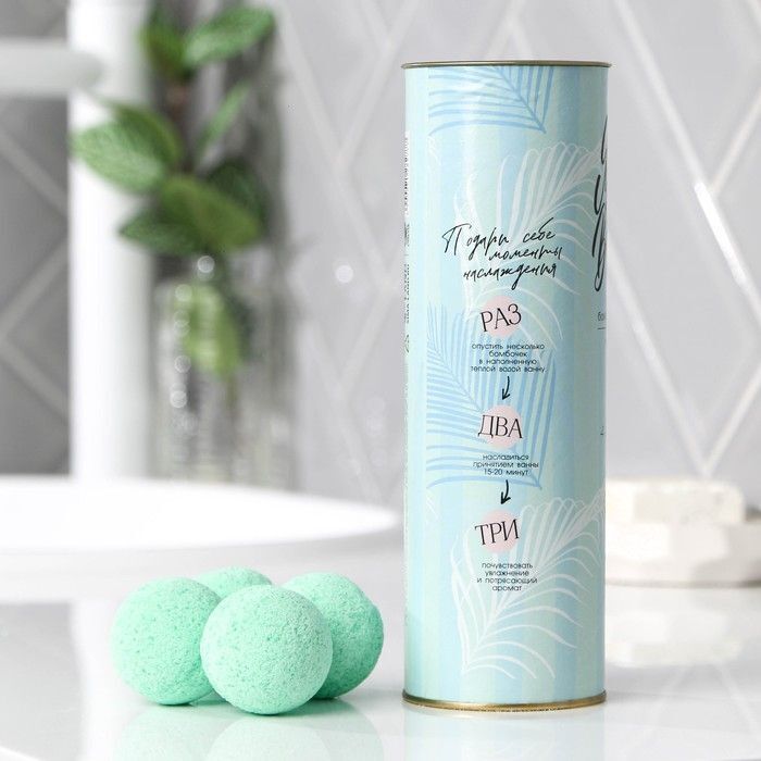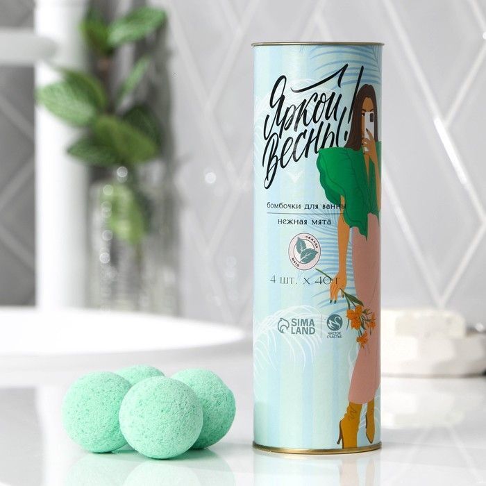 Каждая бомбочка имеет диаметр около 4-5 см и выполнена в светло-зеленом цвете, что делает их не только полезными, но и красивыми. Упаковка оформлена в светлых тонах с изображением природы, что создает атмосферу весны и свежести. Набор бомбочек для ванны «Яркой весны!» — это отличный способ порадовать себя или сделать приятный подарок близким.