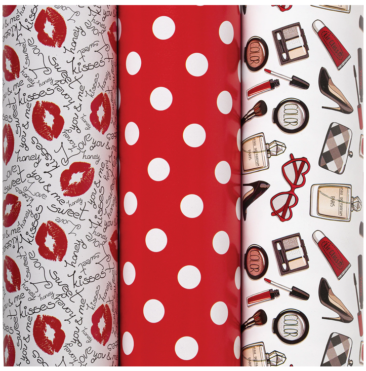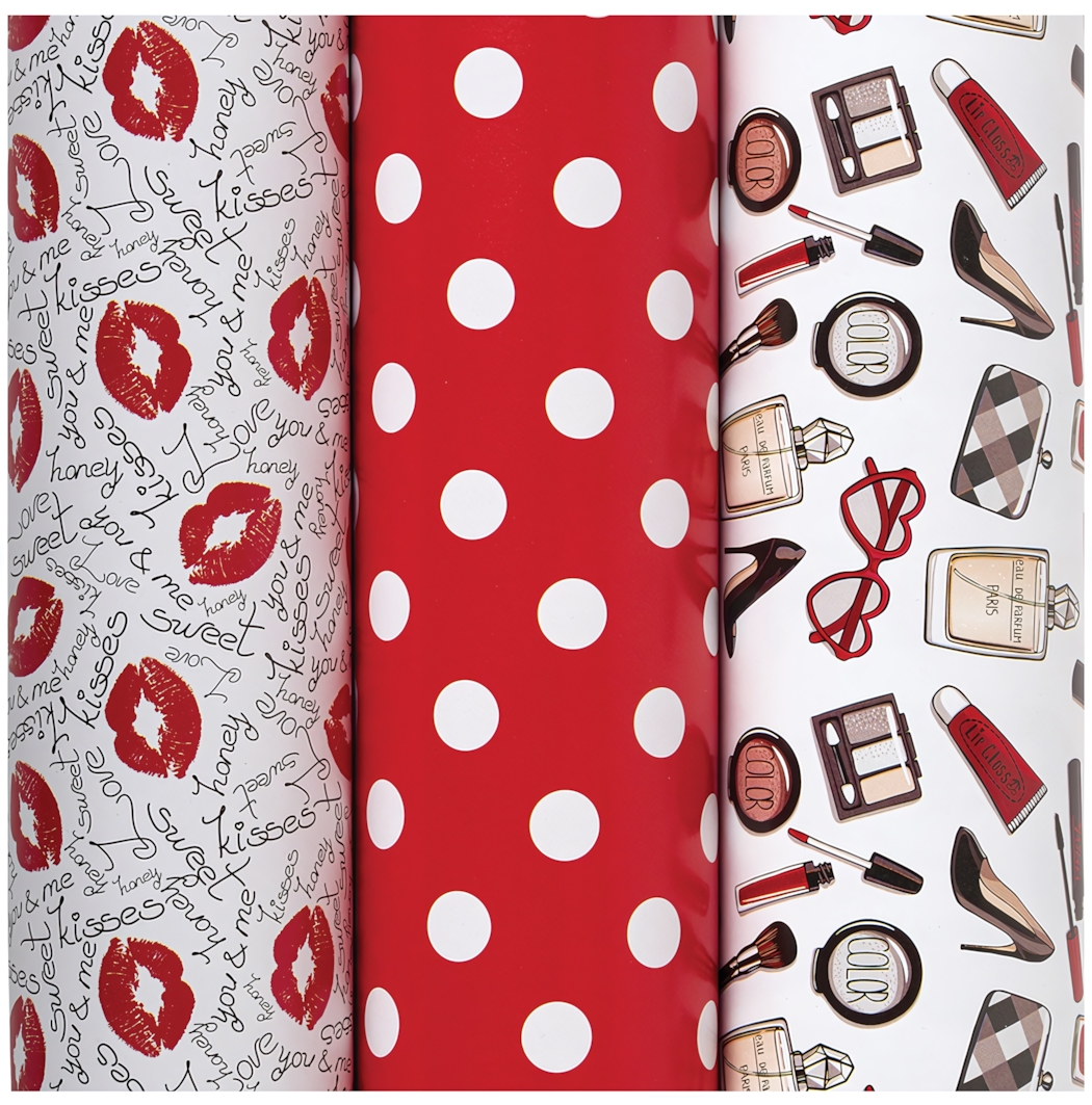 В комплект входят три листа размером 70x100 см с разными принтами: романтичные надписи и поцелуи, выразительный красный горох и модные иллюстрации с аксессуарами. Такое сочетание позволяет оформить несколько подарков в единой концепции или выбрать подходящий вариант под конкретный случай.