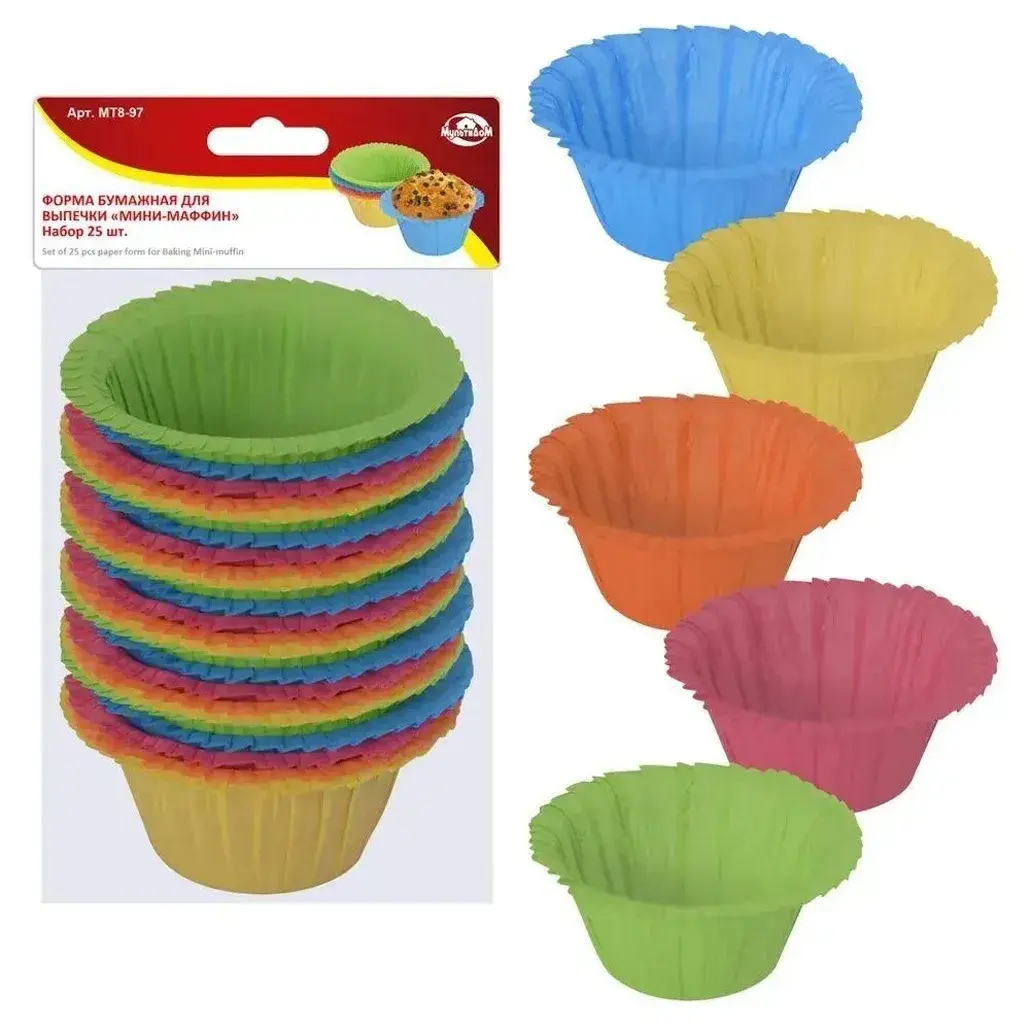 Набор из 25 бумажных форм для мини-маффинов создан для тех, кто ценит аккуратность и яркие детали в кулинарии. Рифлёные края и прочный материал гарантируют чёткую форму десертов, а разноцветные оттенки добавят праздничного настроения вашим угощениям.