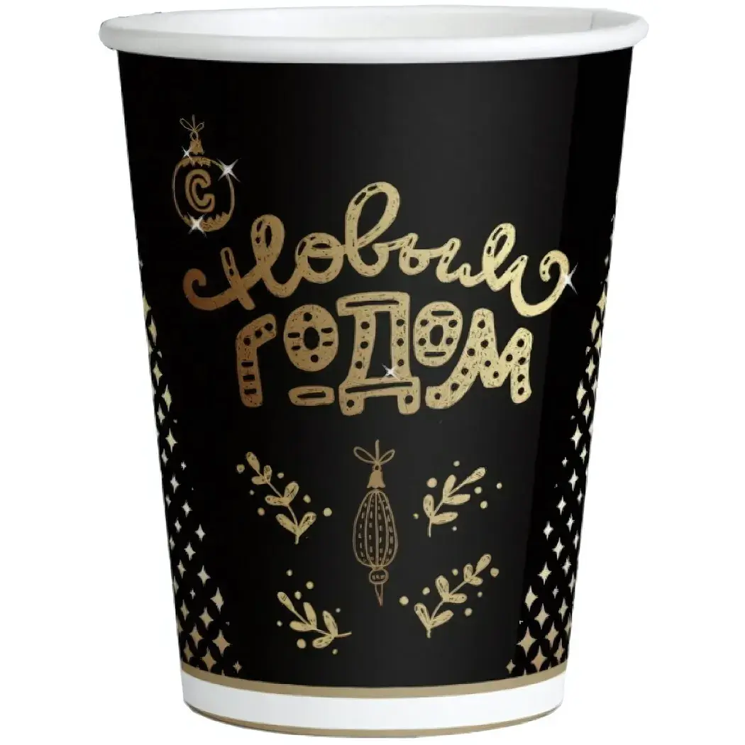 Новогодний стакан бумажный 250мл, черный/золотой, 6шт, праздничный дизайн