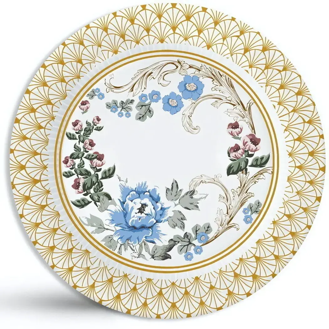 Почему стоит выбрать именно этот набор? Во-первых, он сэкономит ваше время на уборку после мероприятия, так как одноразовые тарелки избавляют от необходимости мыть посуду. Во-вторых, стильный цветочный дизайн с золотистой окантовкой добавит изысканности вашему столу, а разнообразие цветов – голубого, розового и зеленого – позволит легко сочетать тарелки с другими элементами сервировки.