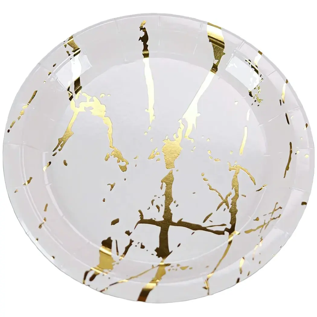 Создайте атмосферу праздника с набором бумажных тарелок «Белый мрамор». Эти стильные тарелки диаметром 18 см идеально подойдут для сервировки блюд на любом мероприятии, будь то день рождения, свадьба или семейный ужин. Их изысканный дизайн с золотыми мраморными разводами добавит нотку роскоши и элегантности вашему столу.