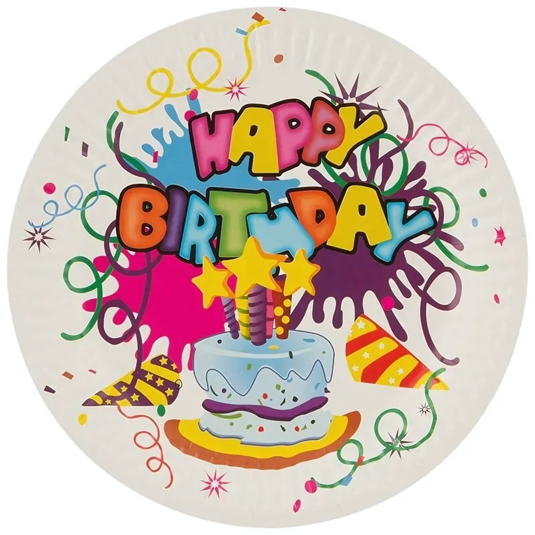 Праздничные бумажные тарелки 'Happy Birthday' станут незаменимым элементом любого торжества. Яркий дизайн с поздравительной надписью и веселыми декоративными элементами создаст по-настоящему праздничное настроение.