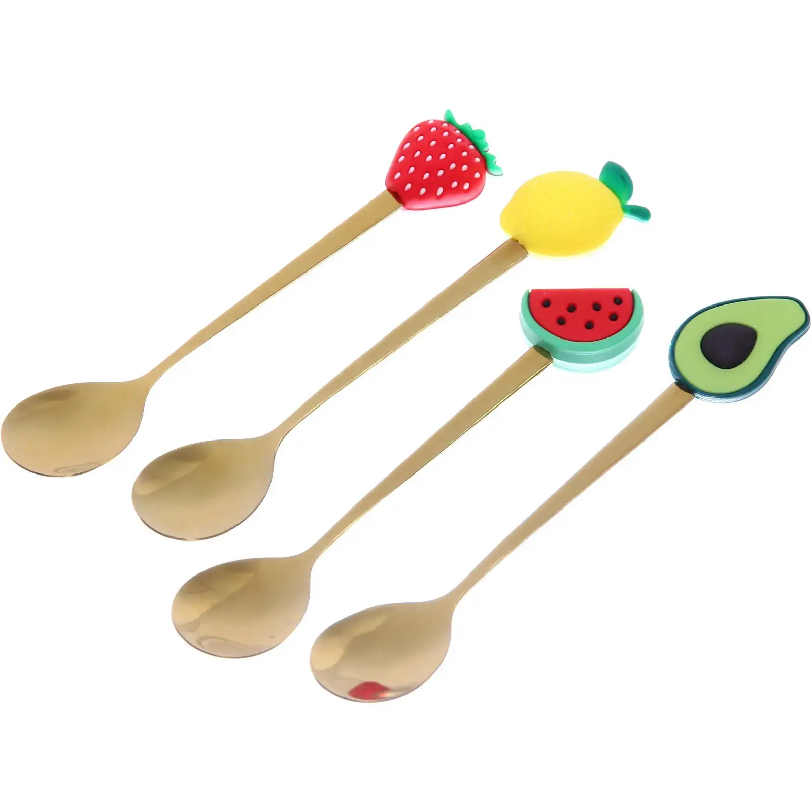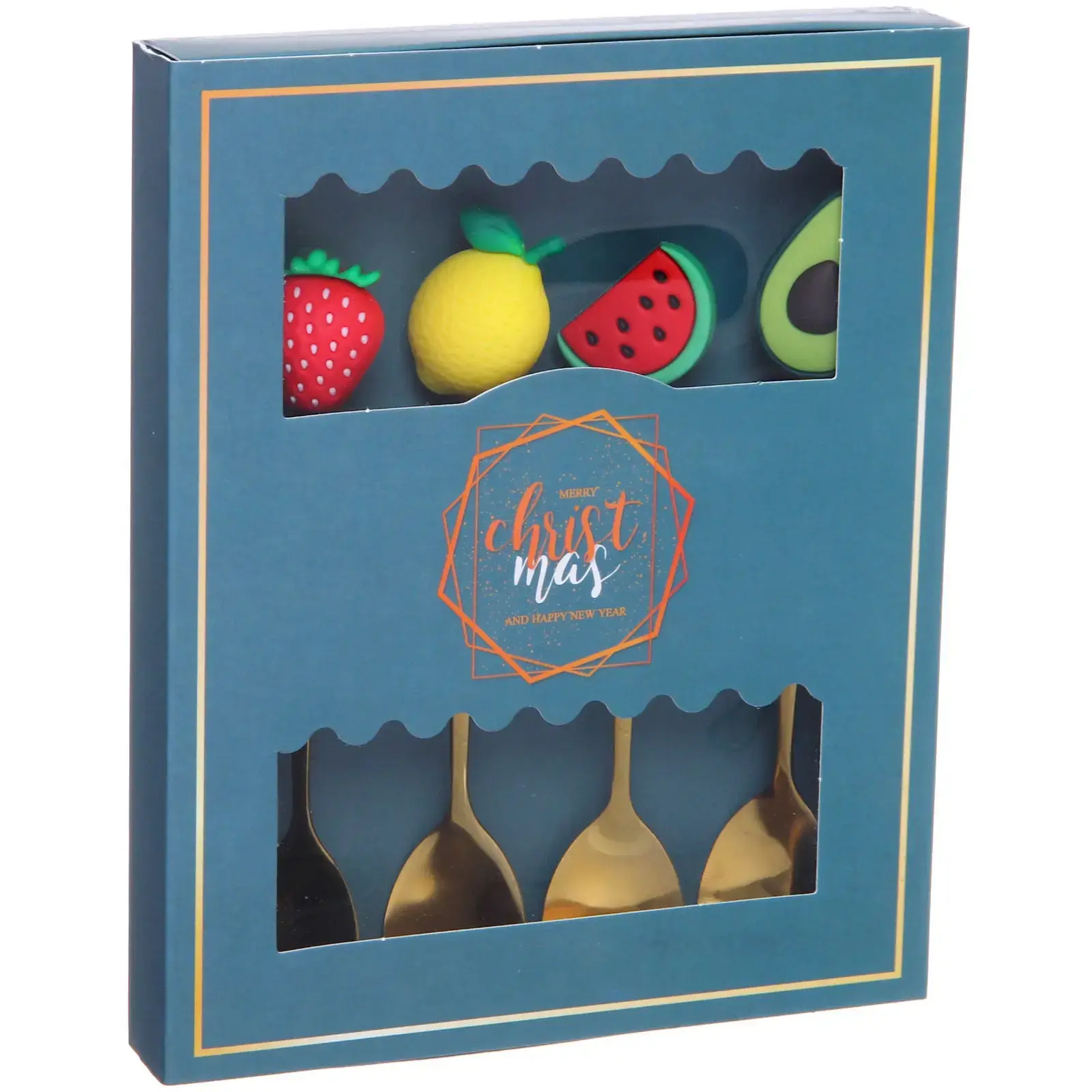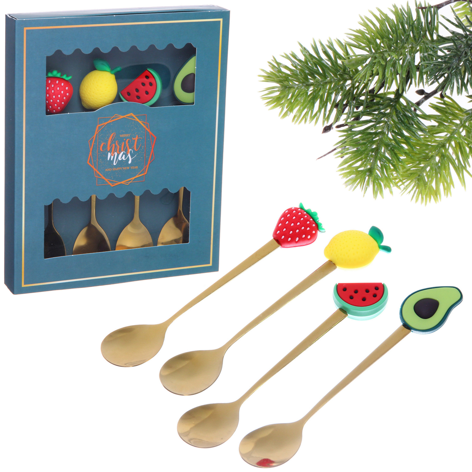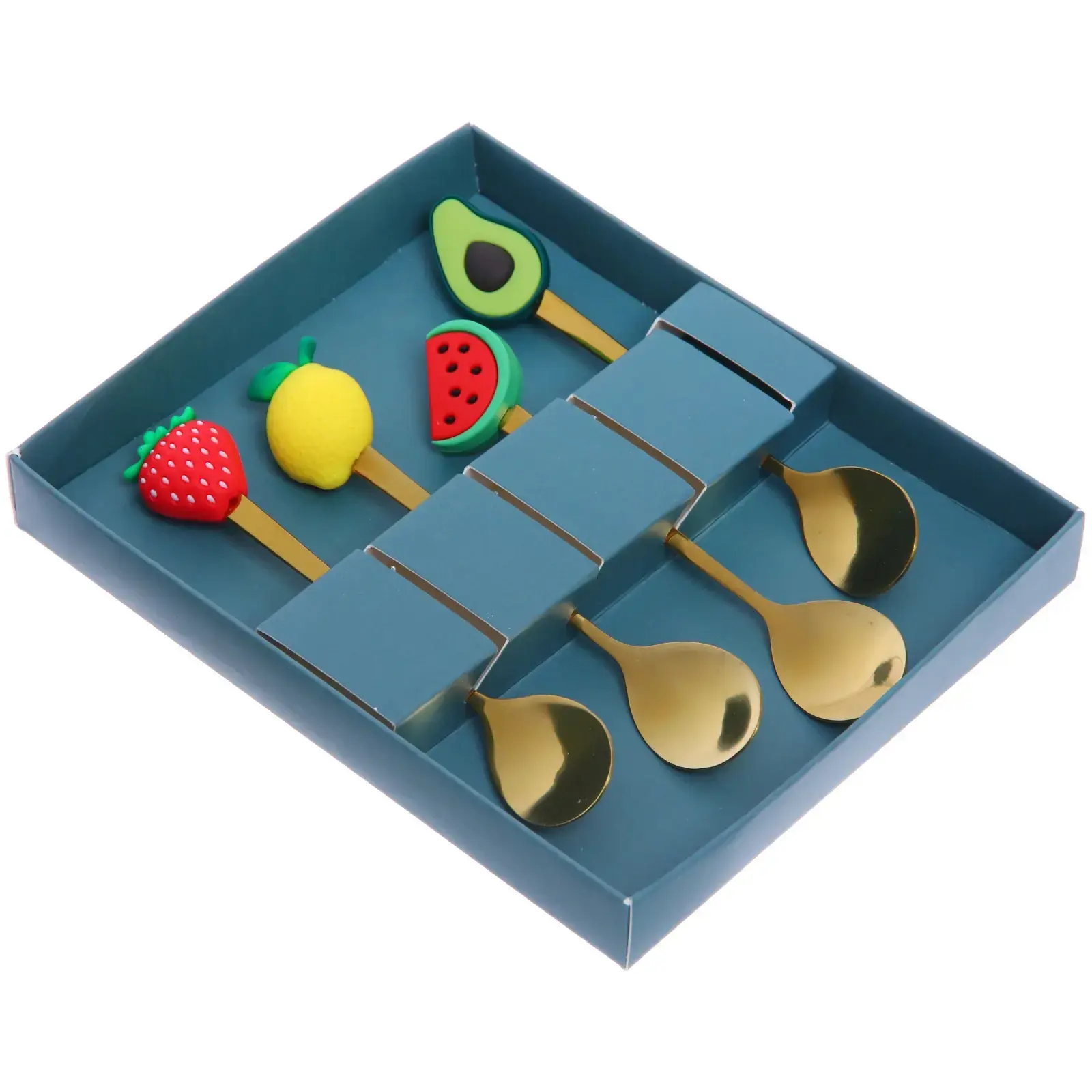 Каждая ложка имеет уникальный декор ручки: клубника, лимон, арбуз и авокадо. Плотный картон коробки с золотым тиснением обеспечивает безопасное хранение. Комплект готов к дарению — не требует дополнительной упаковки.