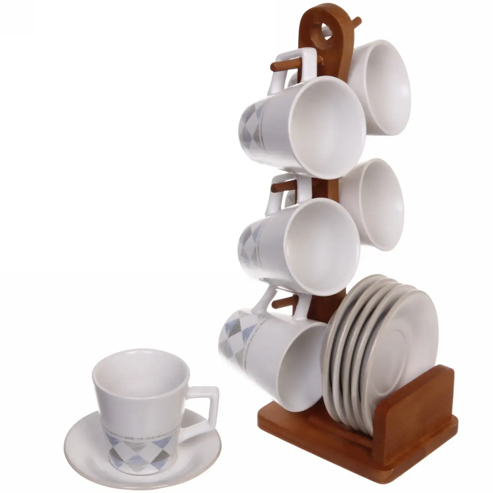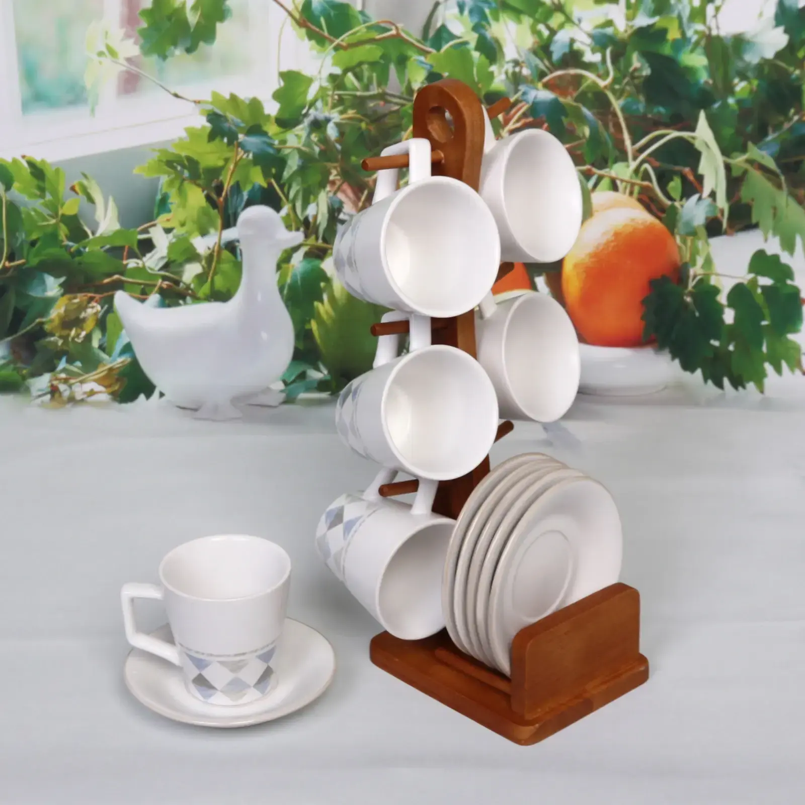 Каждая чашка имеет удобную цилиндрическую форму с эргономичной ручкой. Блюдца диаметром 14 см предотвращают проливание напитков. Подставка высотой 35 см вмещает все 6 пар посуды, сохраняя лёгкий вес (1.2 кг в сборе).