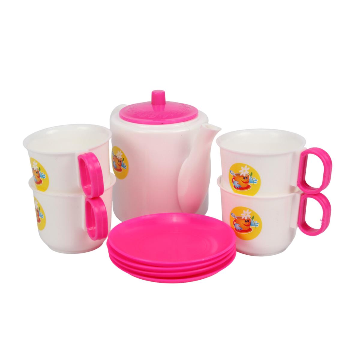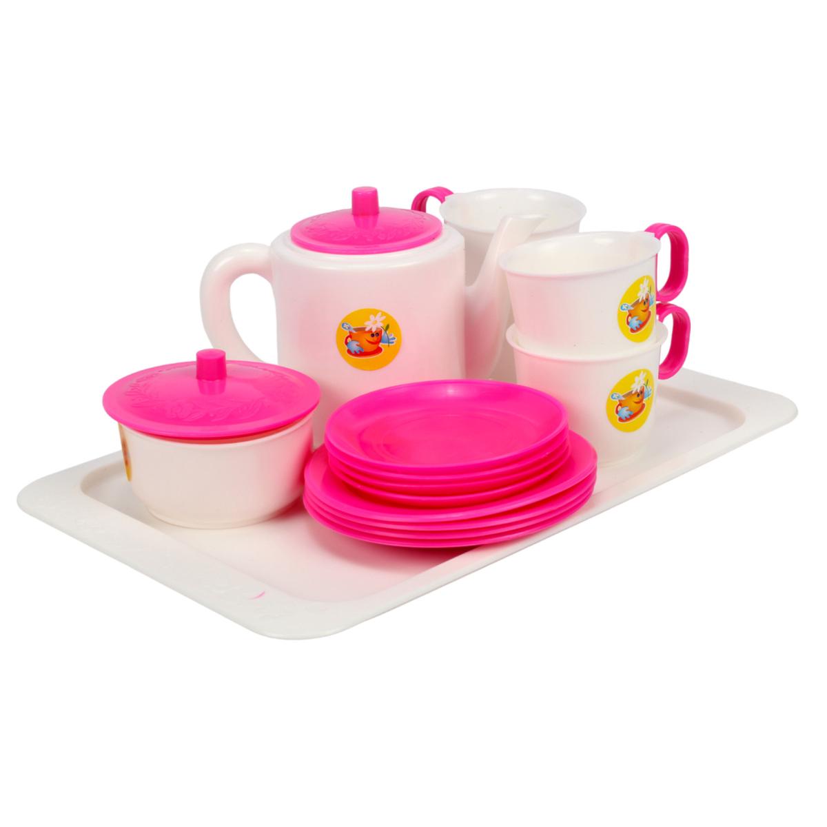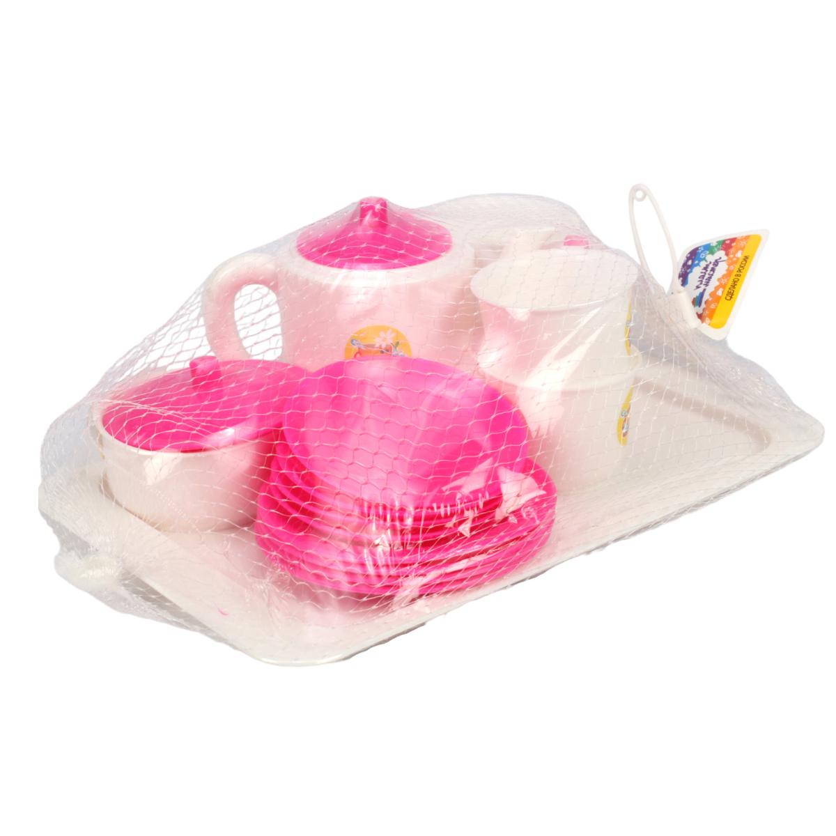 Чайный набор для детских игр, 14 предметов, пластик, розовый/белый, с подносом и чайником