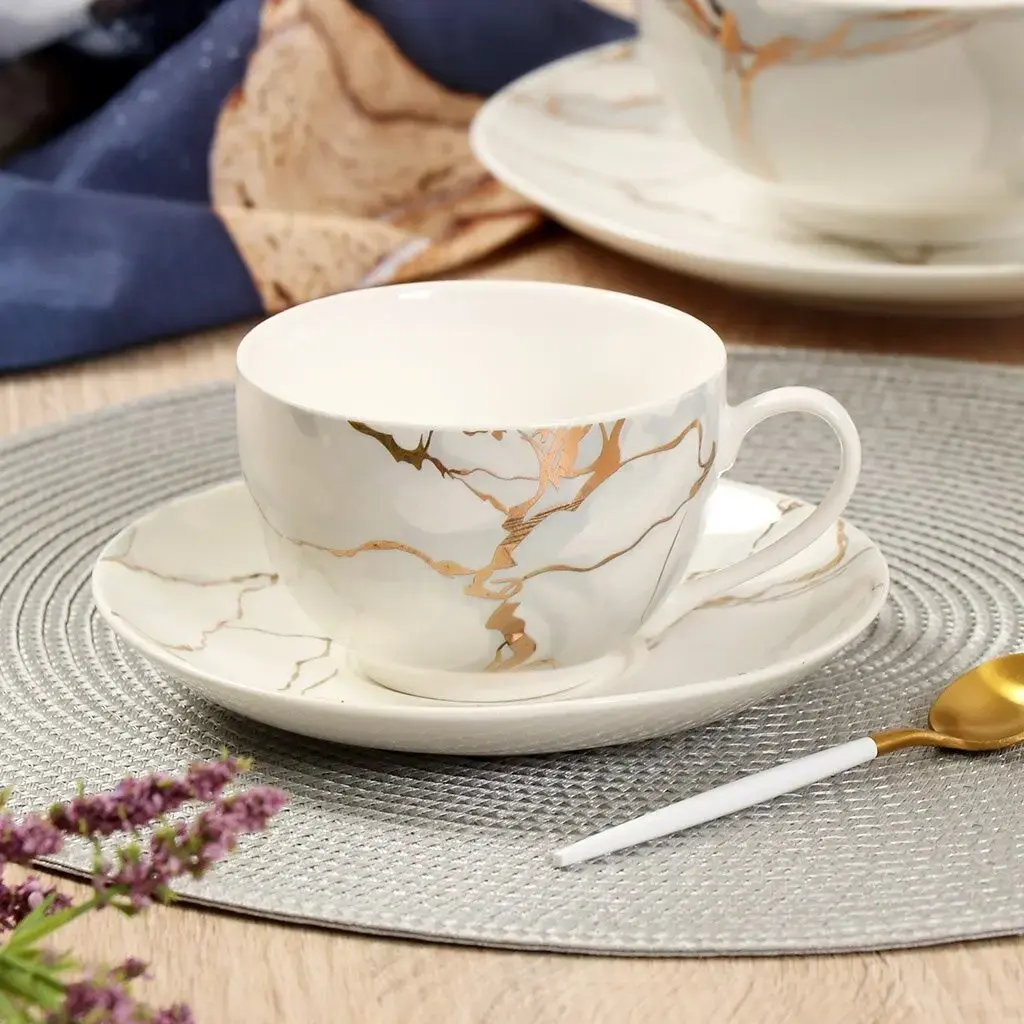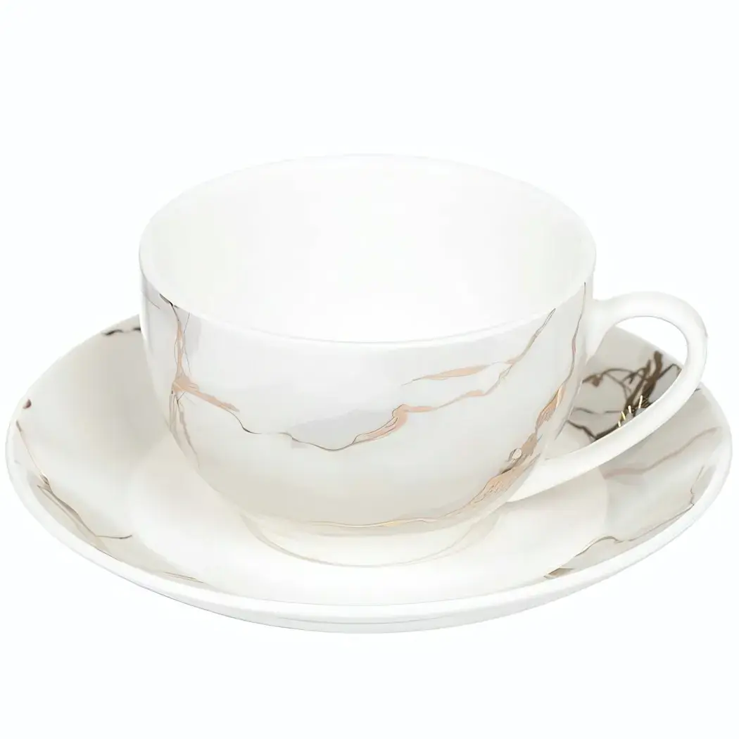 Чайная пара выполнена в белом цвете с мраморным узором, что делает её универсальной для любого стиля сервировки. Размер кружки составляет 250 мл, что идеально подходит для одной порции чая или кофе. Блюдце имеет слегка волнистую форму, добавляя изюминку в общий дизайн. Эта пара станет не только функциональным, но и стильным элементом вашей кухни.
