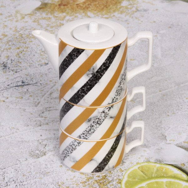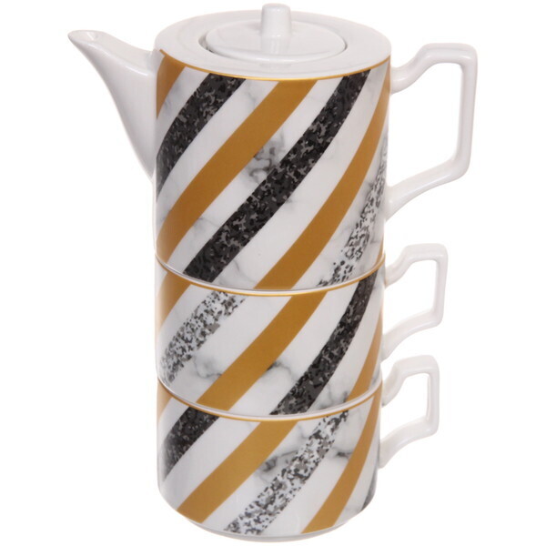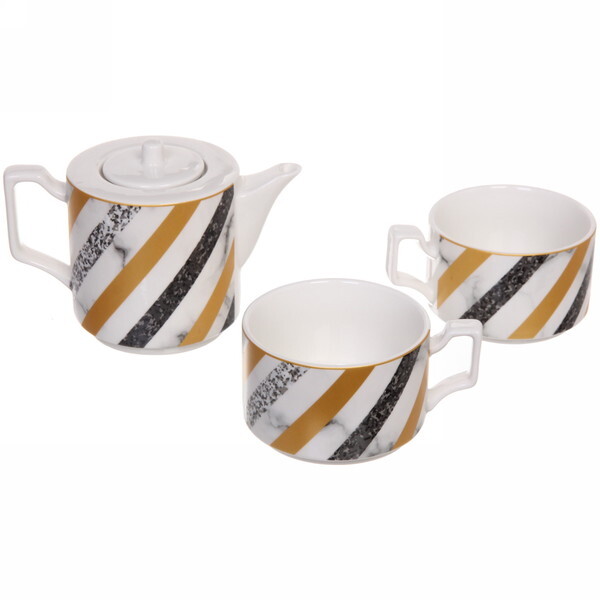 Погрузитесь в атмосферу уюта и комфорта с чайным набором «Rome». Этот стильный набор из трех предметов включает в себя чайник объемом 500 мл и две кружки по 320 мл, что делает его идеальным для дружеских встреч или романтических вечеров. Элегантный дизайн с диагональными полосами в белом, черном и золотом цветах добавляет изысканности вашему столу.
