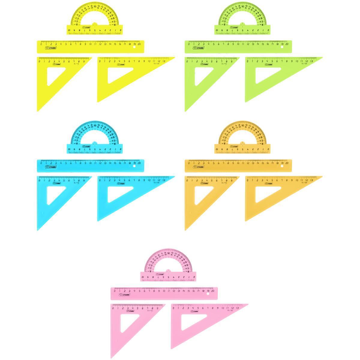 Набор чертежный Стамм, 4 предмета: линейка 20см, треугольники, транспортир, неоновые цвета