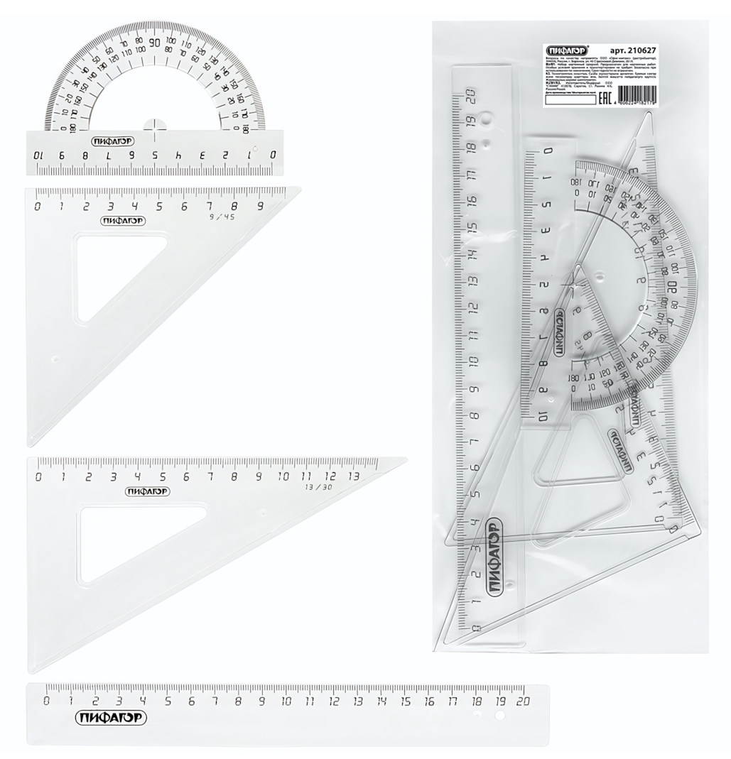 Набор чертёжный «Пифагор»: линейка 20 см, 2 треугольника, транспортир, прозрачный пластик