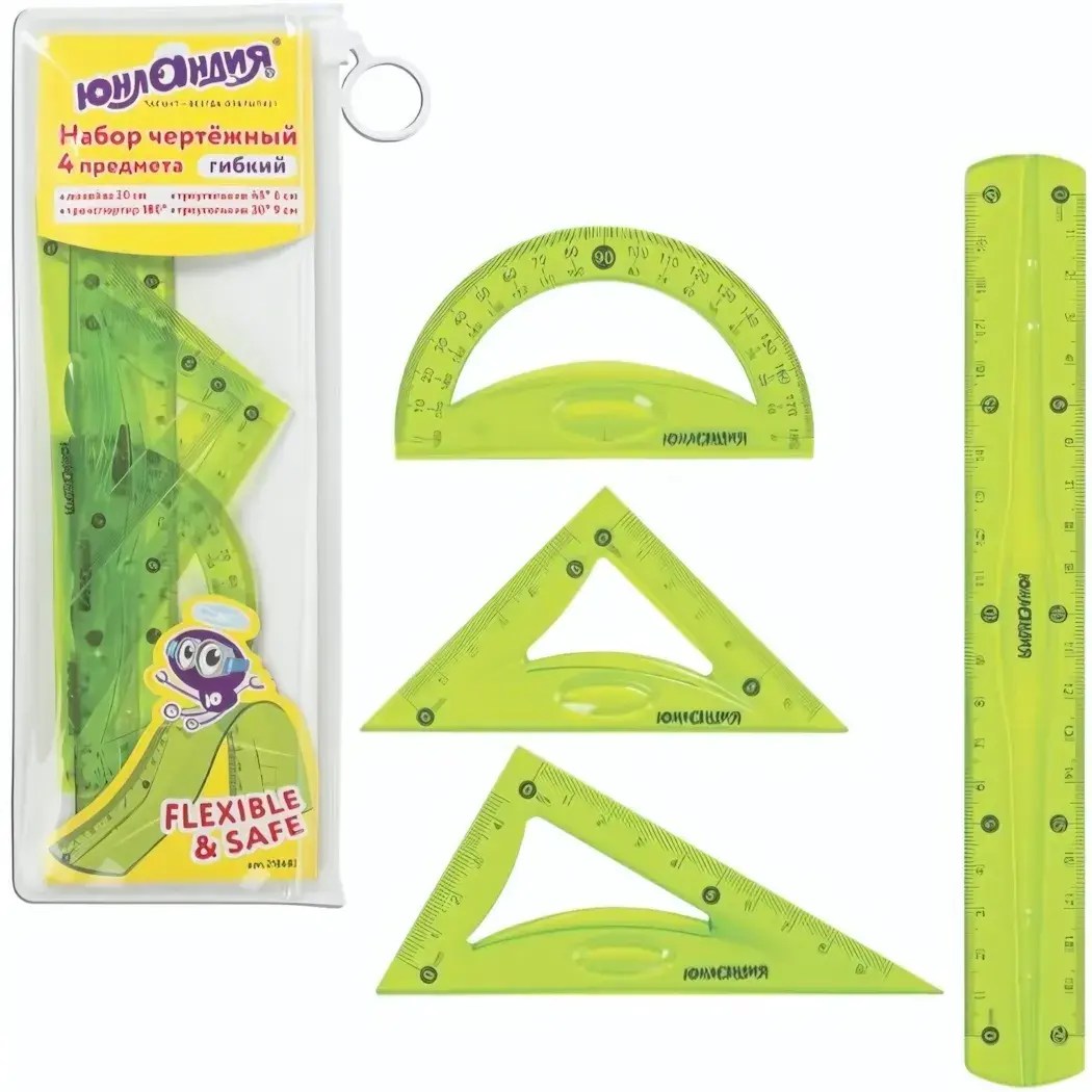 Почему стоит выбрать именно этот набор? Во-первых, гибкий материал обеспечивает долговечность и безопасность при использовании. Во-вторых, эргономичные ручки делают работу с инструментами более комфортной. В-третьих, четкие деления на линейке и транспорте позволяют добиться высокой точности в измерениях.