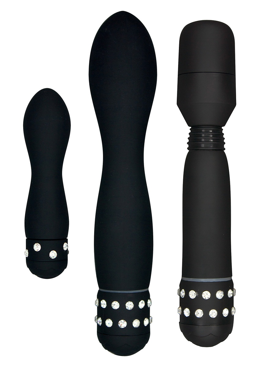Все три предмета выполнены из анодированного пластика ABS, который отличается гладкой поверхностью, приятной на ощупь и простой в уходе. Декоративные вставки с прозрачными камнями в нижней части каждого вибратора добавляют элегантности и создают эффект драгоценных аксессуаров. Закруглённые концы обеспечивают комфортное и безопасное использование.