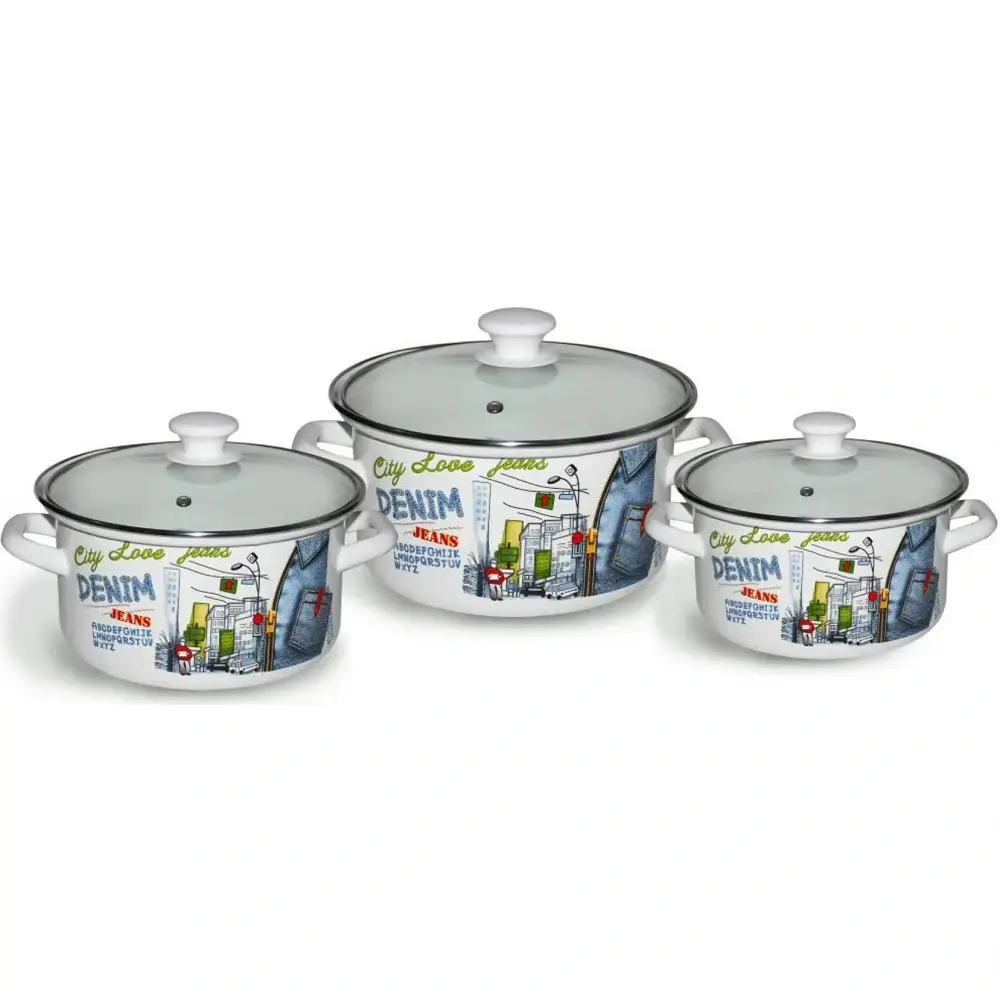 Набор кастрюль 'DENIM-1-Экстра' создан для тех, кто ценит функциональность и оригинальный дизайн. Белоснежное покрытие с эффектом денима и городским принтом станет ярким акцентом на вашей кухне.