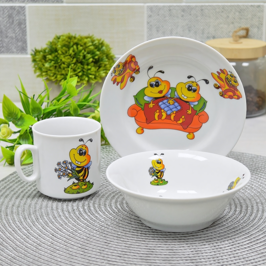 Почему стоит выбрать именно этот набор? Во-первых, он выполнен из высококачественного фарфора, который легко моется и не впитывает запахи. Во-вторых, яркие и мультяшные изображения пчелок привлекут внимание вашего малыша и сделают процесс еды более увлекательным. В-третьих, гладкая поверхность посуды обеспечивает легкость в уходе и долговечность использования.