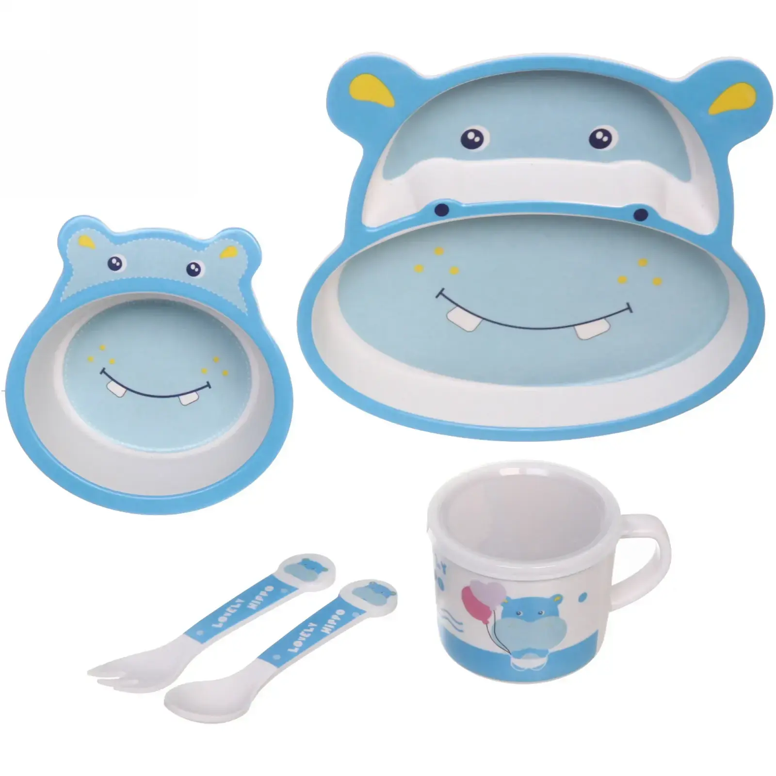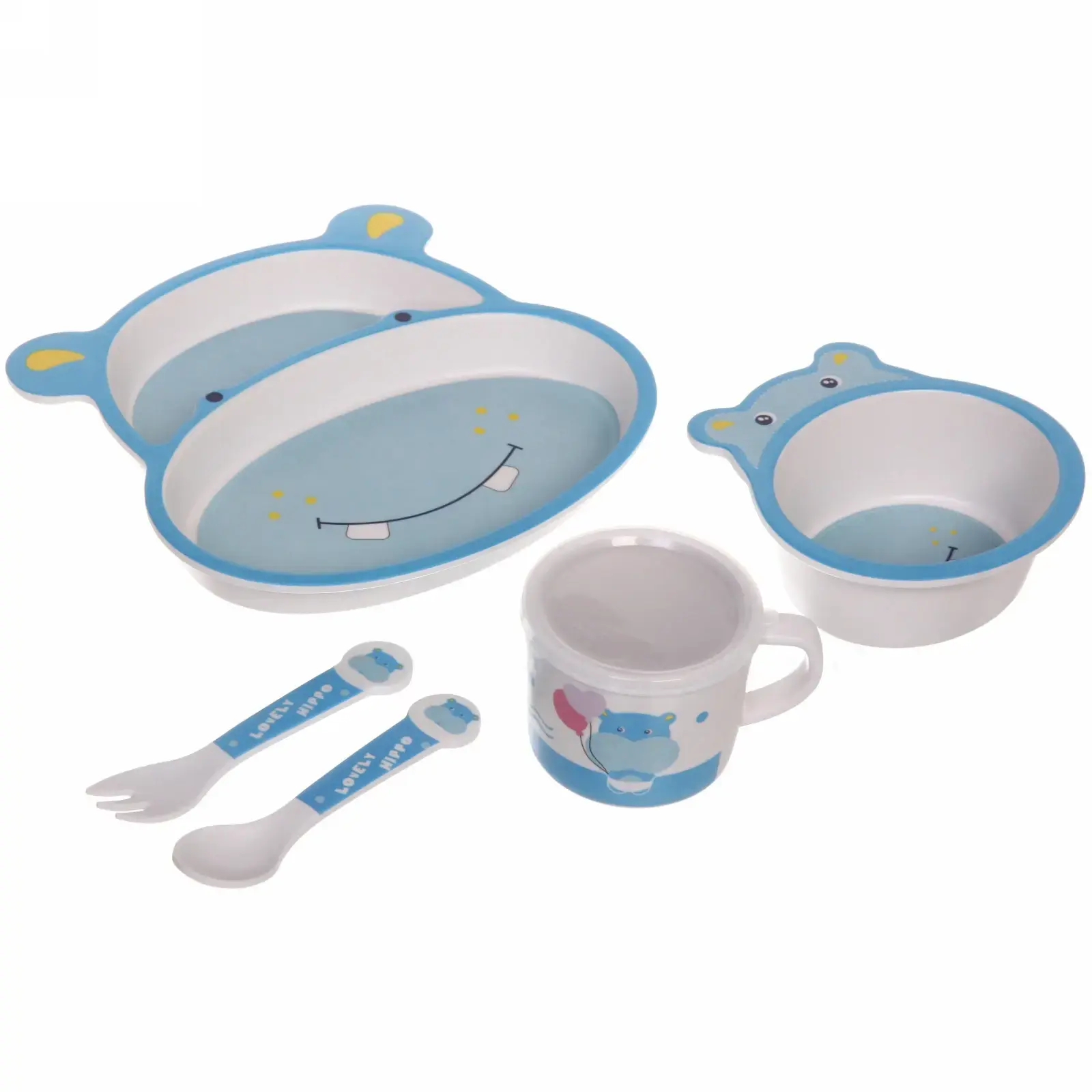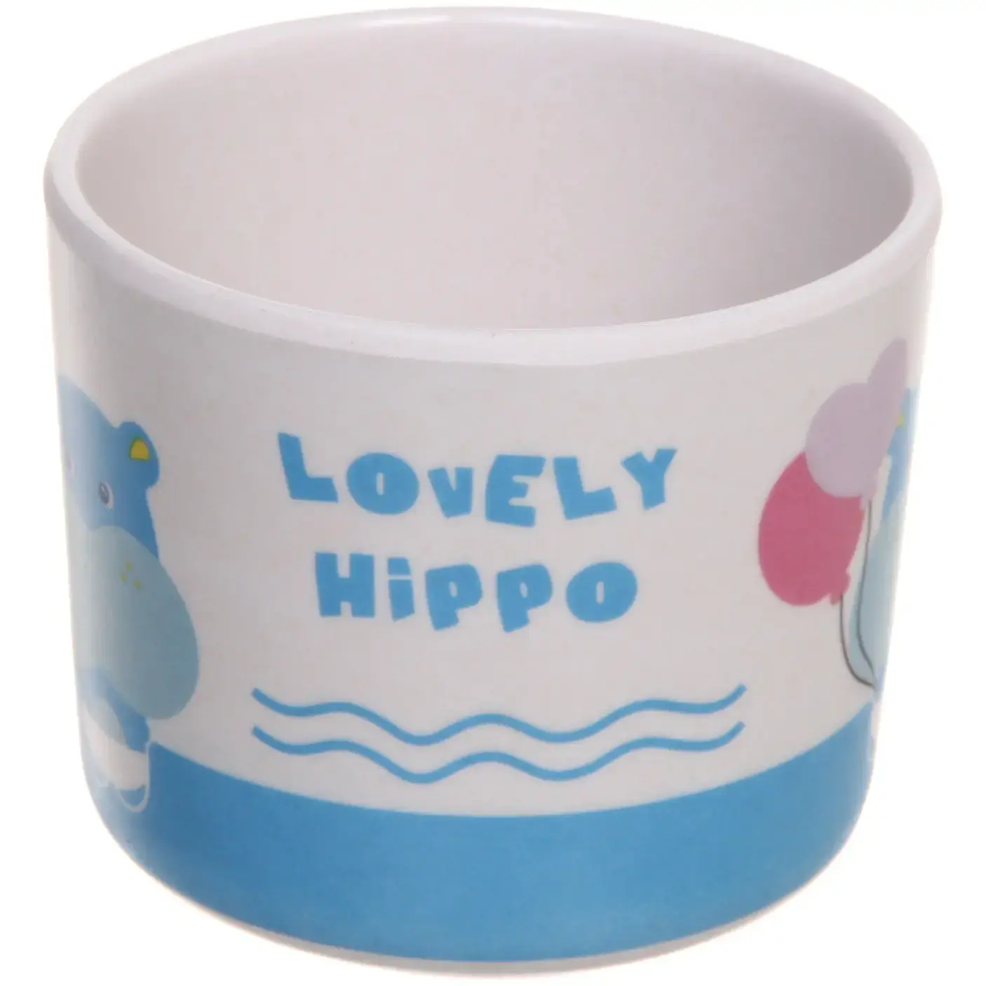 Набор включает в себя тарелку, глубокую миску, кружку и два столовых прибора — ложку и вилку. Все предметы имеют округлые формы и яркие цвета, что делает их привлекательными для детей. Тарелка и миска выполнены в форме гипопотама, что добавляет элемент игры в процесс приема пищи. Кружка с изображением гипопотама и воздушных шаров станет любимым аксессуаром вашего малыша.