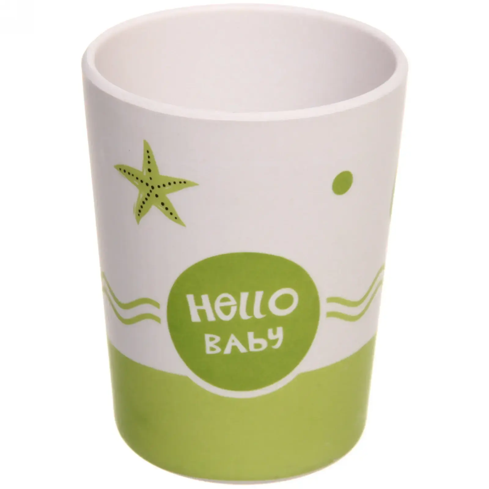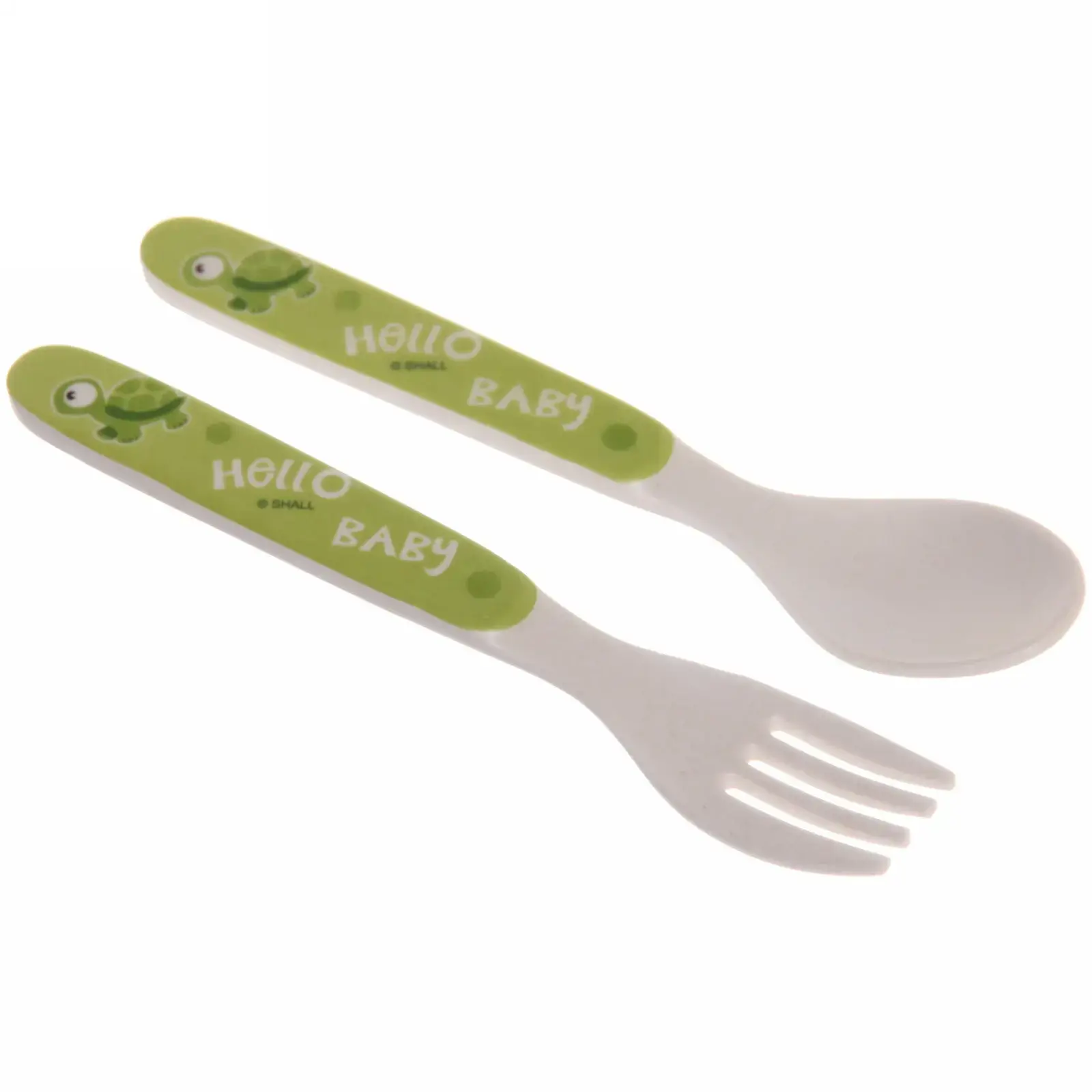 Размеры конкретных элементов не указаны, но все предметы имеют стандартные размеры для детской посуды. Набор выполнен в различных оттенках зеленого и белого цвета, что делает его стильным и привлекательным. Столовые приборы имеют надпись «HELLO BABY» на ручках, что добавляет дополнительный элемент дизайна.