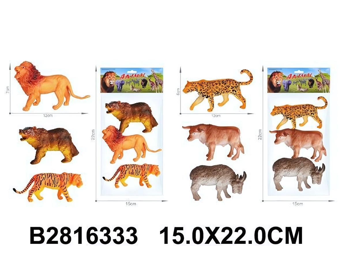 В набор входят 3 фигурки диких животных в упаковке размером 15×4×22 см. Материал — безопасный ПВХ, устойчивый к деформации и легко моющийся. Компактный формат позволяет брать игрушки в поездки или хранить дома без лишнего места.