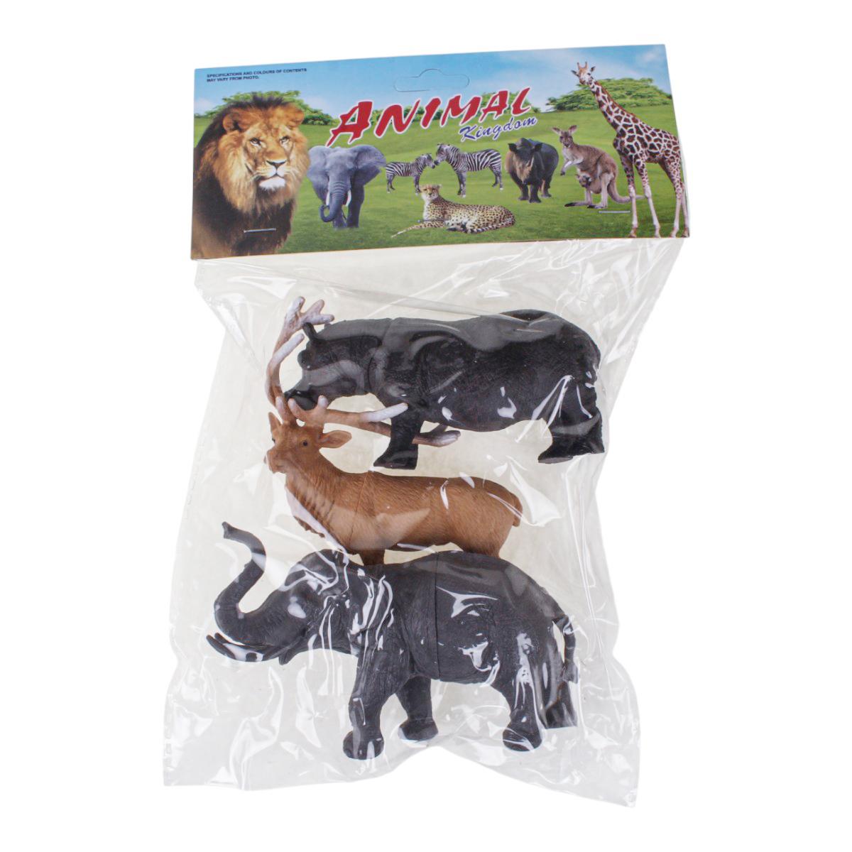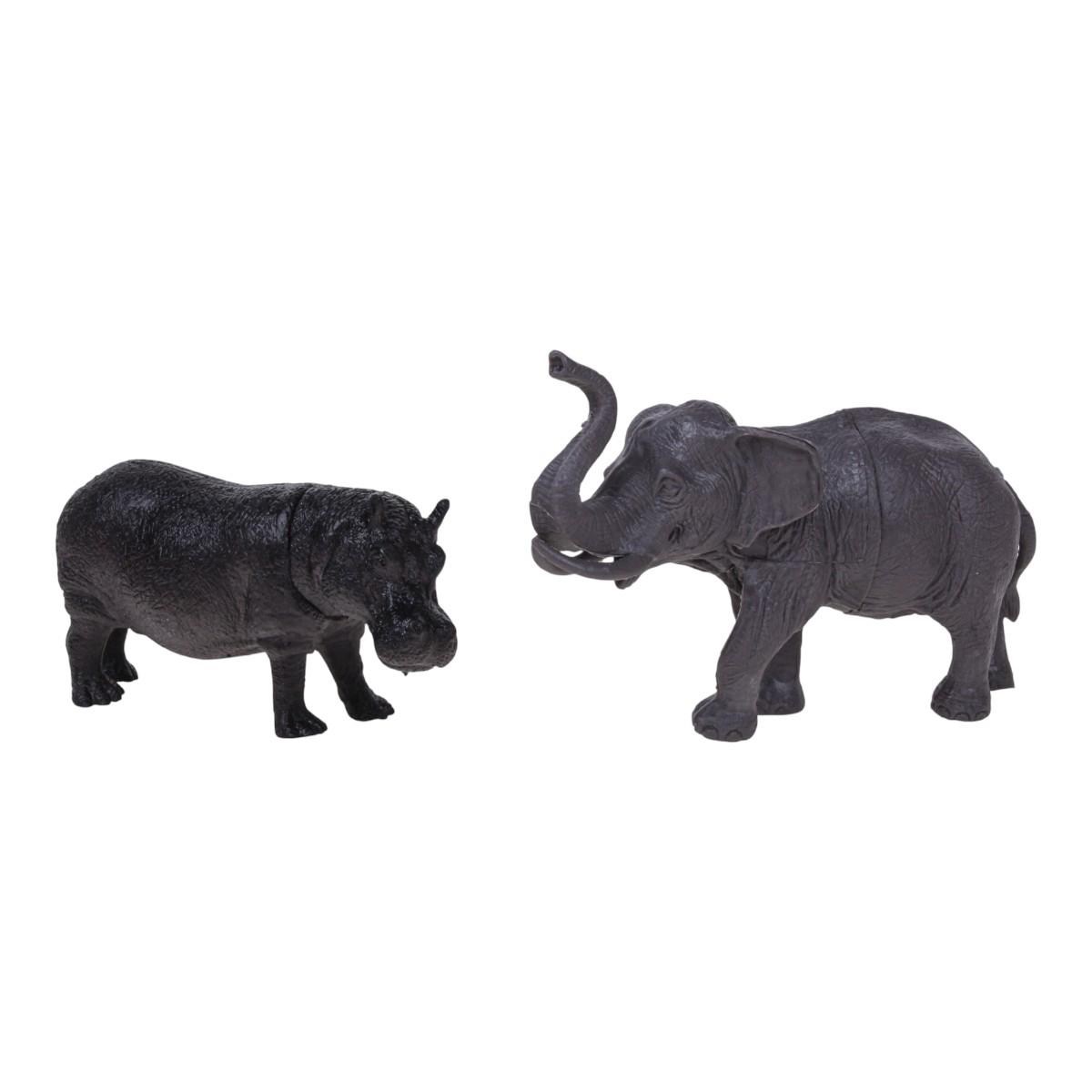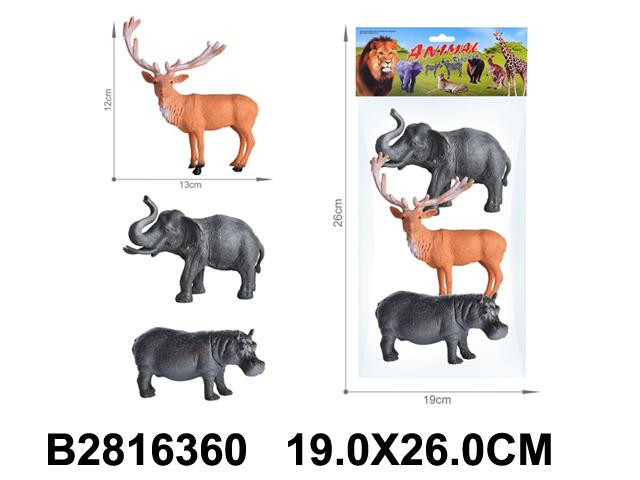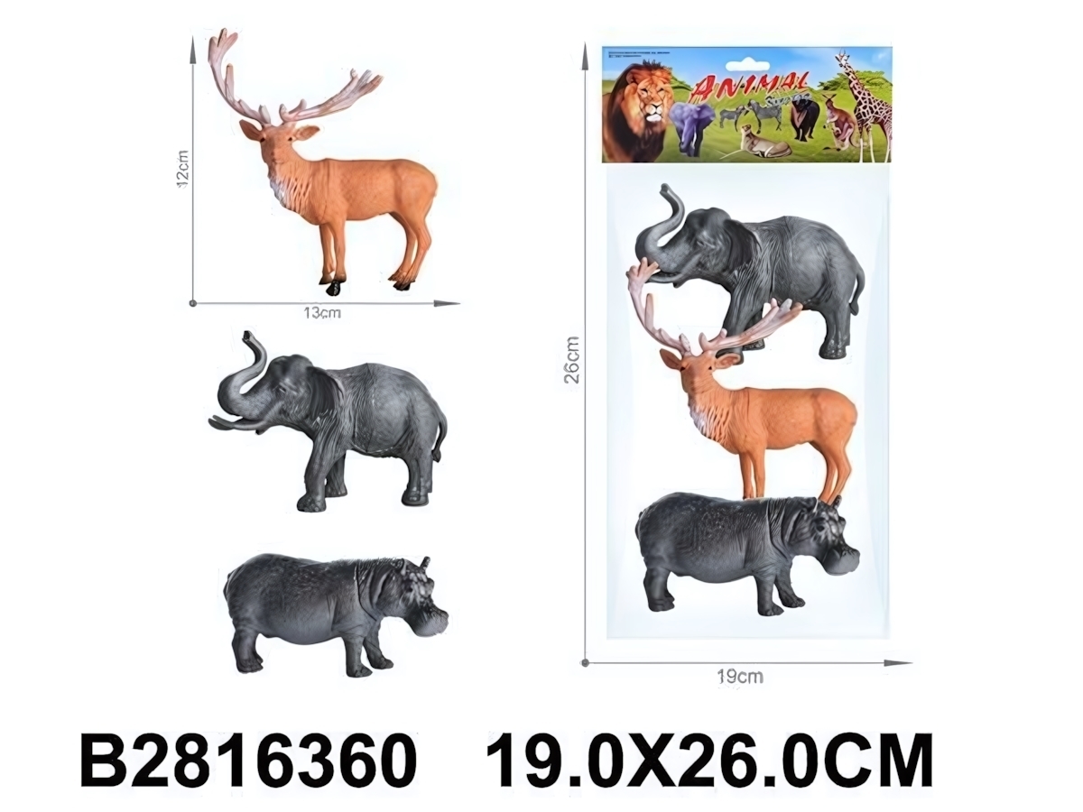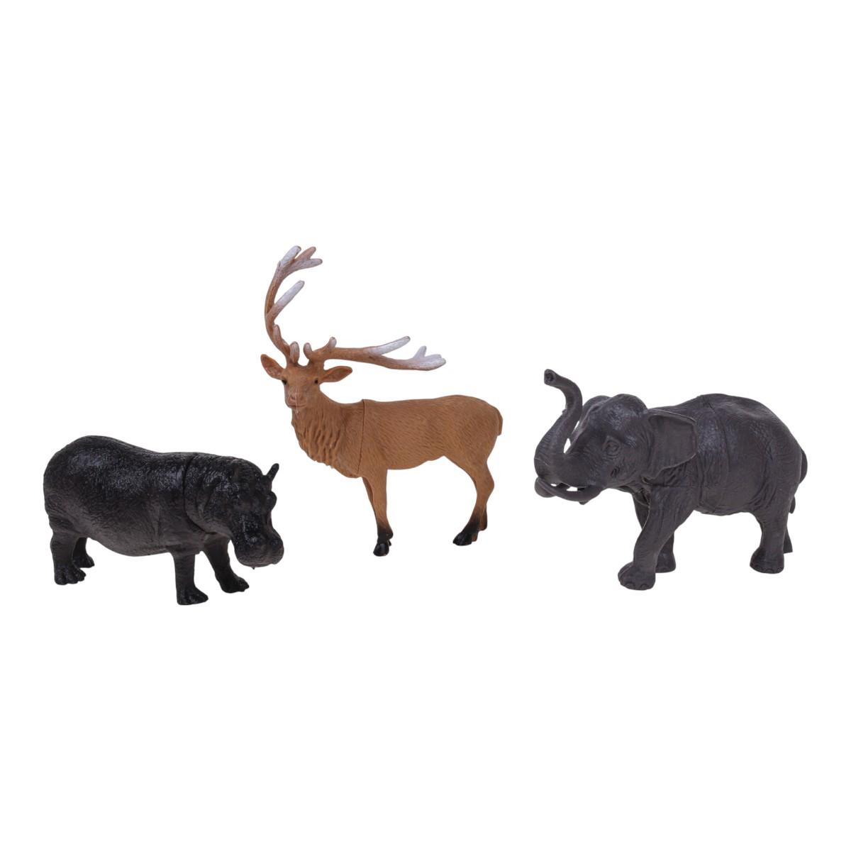 - Три детализированных фигурки животных: олень с крупными рогами, слон с поднятым хоботом, бегемот.
