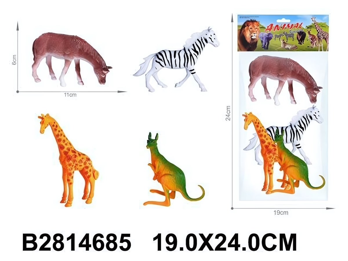 Фигурки выполнены из безопасного ПВХ, приятного на ощупь. Высота элементов примерно 6 см, длина — около 11 см (например, у бегемота). Яркие, контрастные цвета привлекают внимание и стимулируют интерес ребёнка. Упаковка — прозрачный пакет с картонной верхней частью и красочной иллюстрацией животных, размер 24×19 см.
