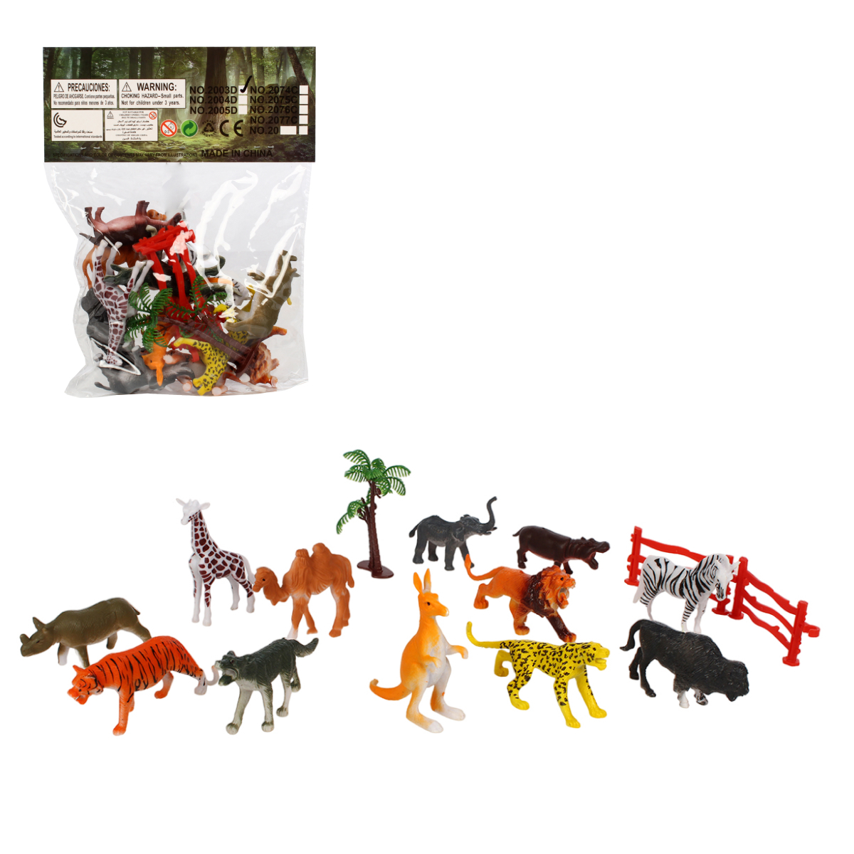 Размер упаковки составляет 24,0 * 17,7 * 3,0 см, что делает его удобным для хранения и транспортировки. Фигурки имеют яркие цвета, такие как оранжевый, черный, коричневый, желтый и белый, что делает их привлекательными для детей. Набор включает в себя не только животных, но и элементы окружения, такие как деревья и заборы, что позволяет создавать различные игровые сцены.