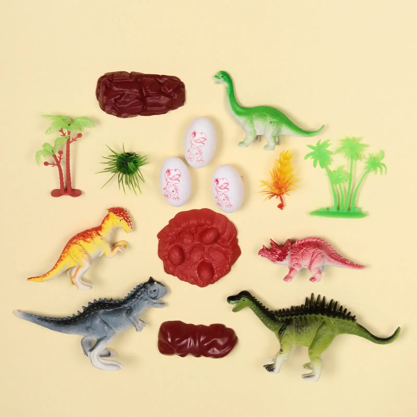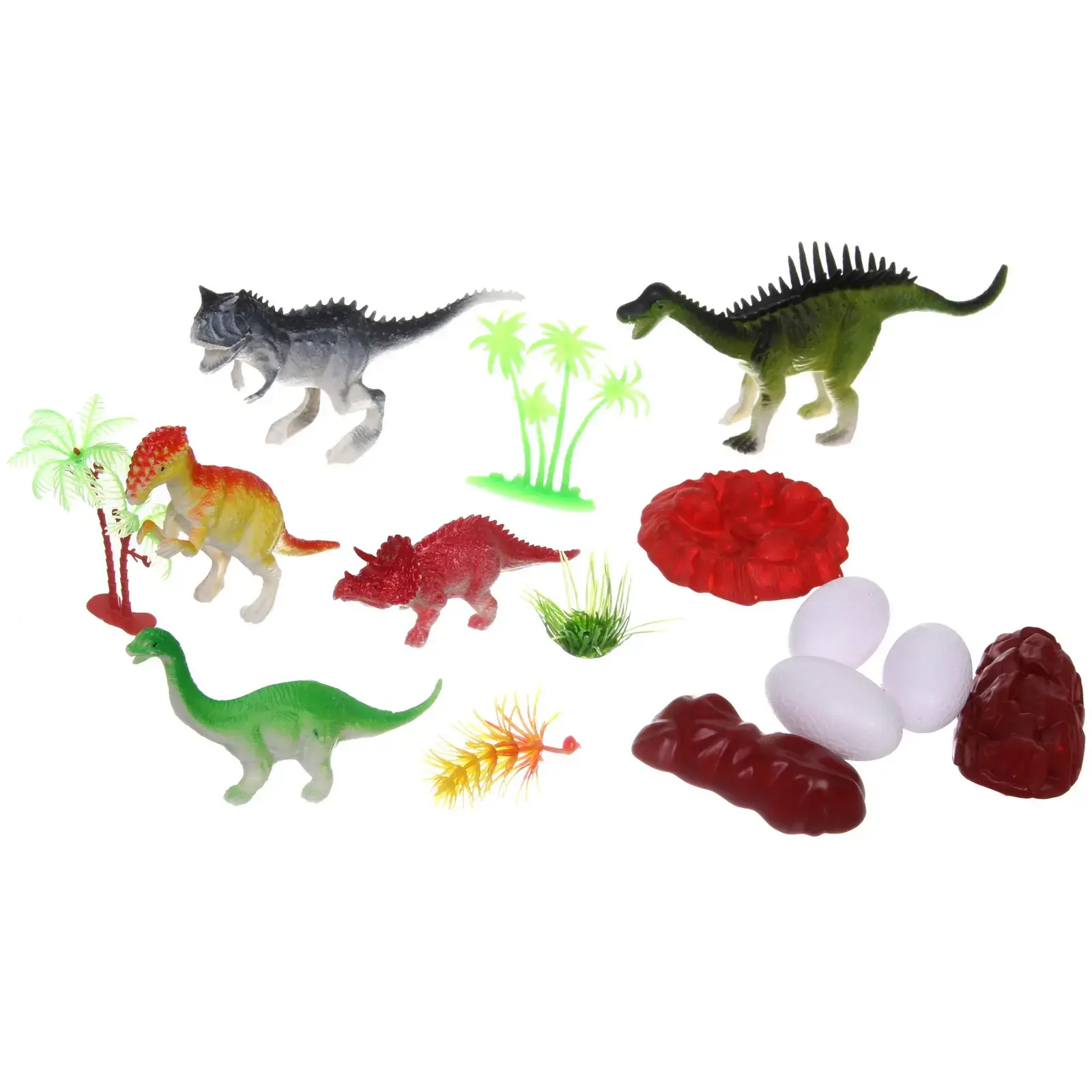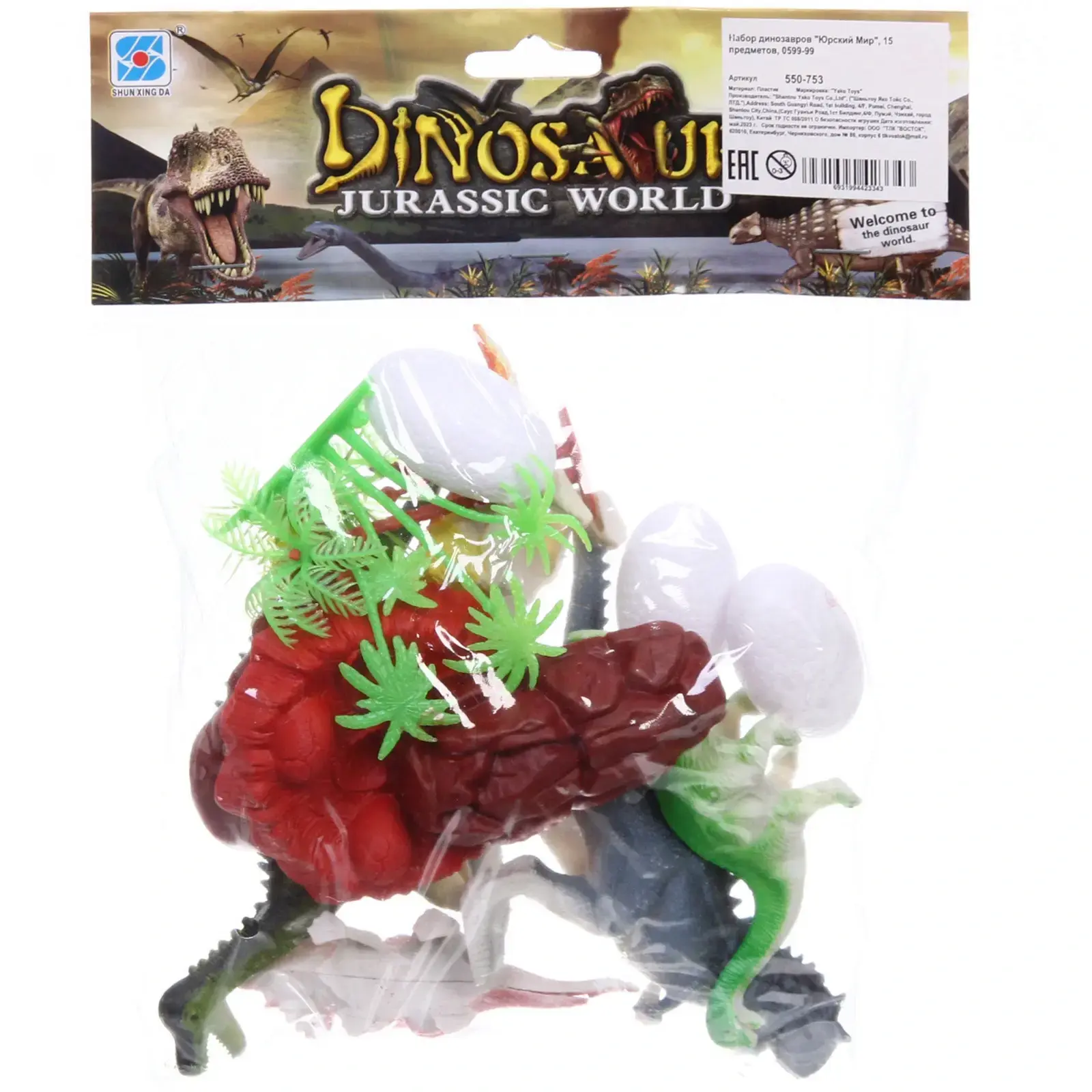 В набор входят 15 пластиковых фигурок динозавров, выполненных в различных цветах: зеленом, красном, желтом и сером. Размеры фигурок варьируются, что позволяет детям создавать свои уникальные игровые сцены. Набор также включает элементы декора, такие как пальмовые деревья и яйца, что делает игру еще более интересной и разнообразной.