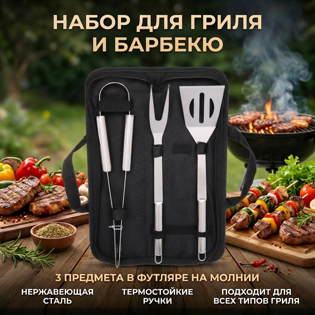 В комплект входят три основных инструмента: щипцы, вилка и лопатка, выполненные из качественной нержавеющей стали. Они идеально подходят для работы на гриле или мангале, обеспечивая надежность и долговечность. Длинные ручки инструментов позволяют безопасно манипулировать горячей пищей, что делает процесс приготовления более удобным и безопасным.