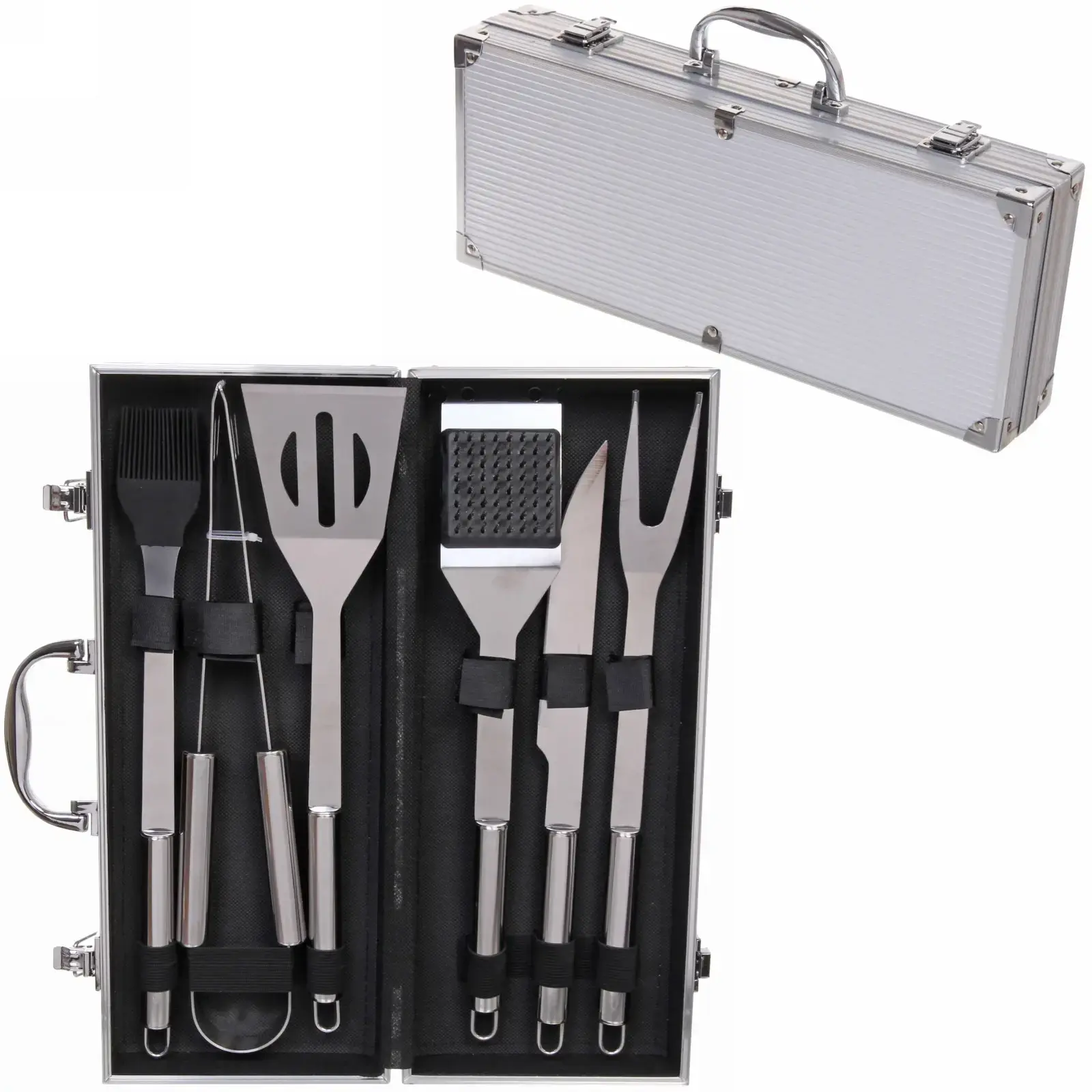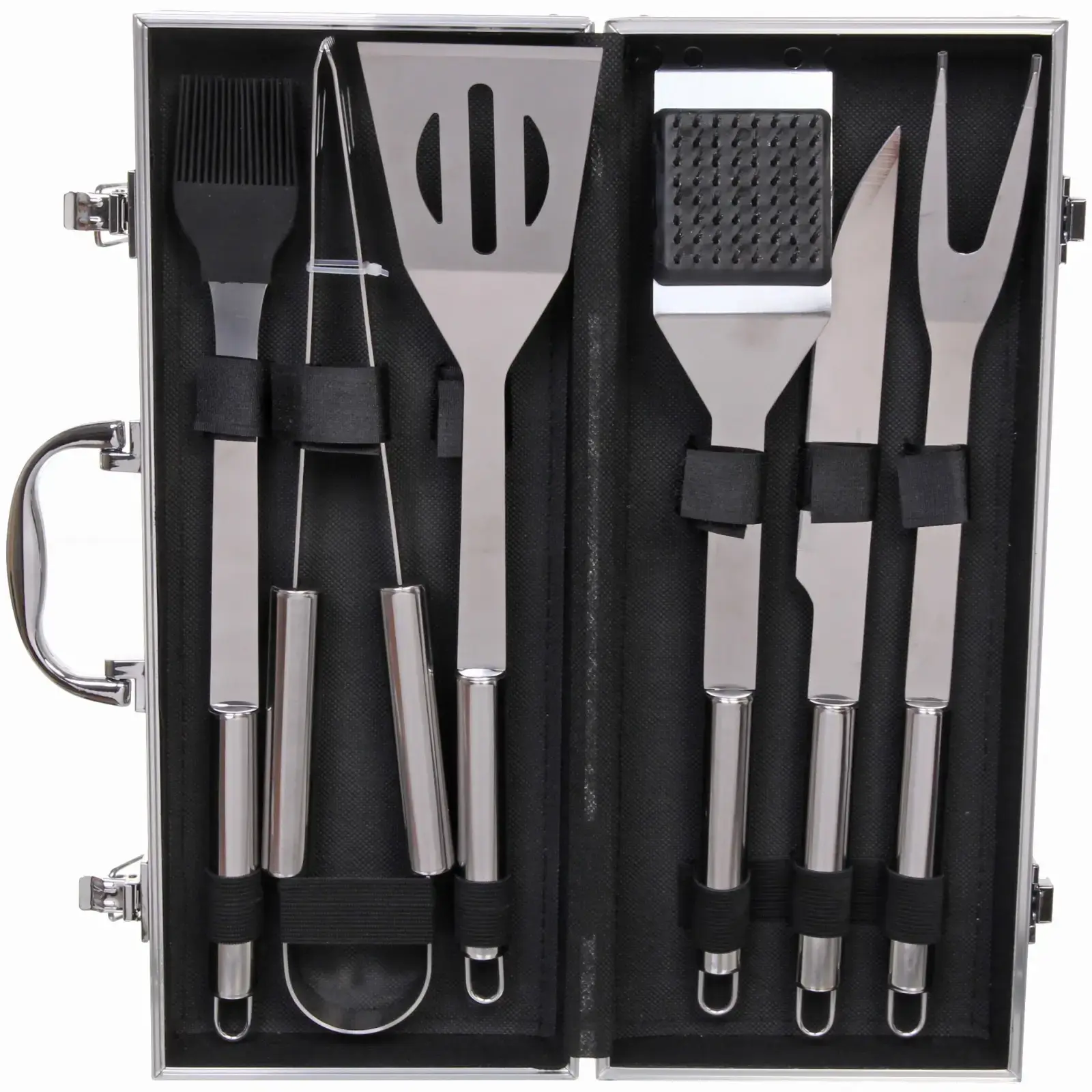 В набор входят шесть необходимых инструментов: щипцы, вилка, лопатка, нож, кулинарная кисточка и щетка-скребок. Все предметы выполнены из качественной нержавеющей стали, что обеспечивает их долговечность и надежность. Инструменты удобно лежат в руке и позволяют легко переворачивать, нарезать и смазывать продукты во время готовки.