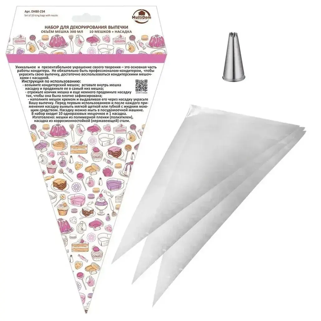 Набор для декора выпечки с металлической насадкой, 10 мешков 300 мл, полиэтилен, удобство формования