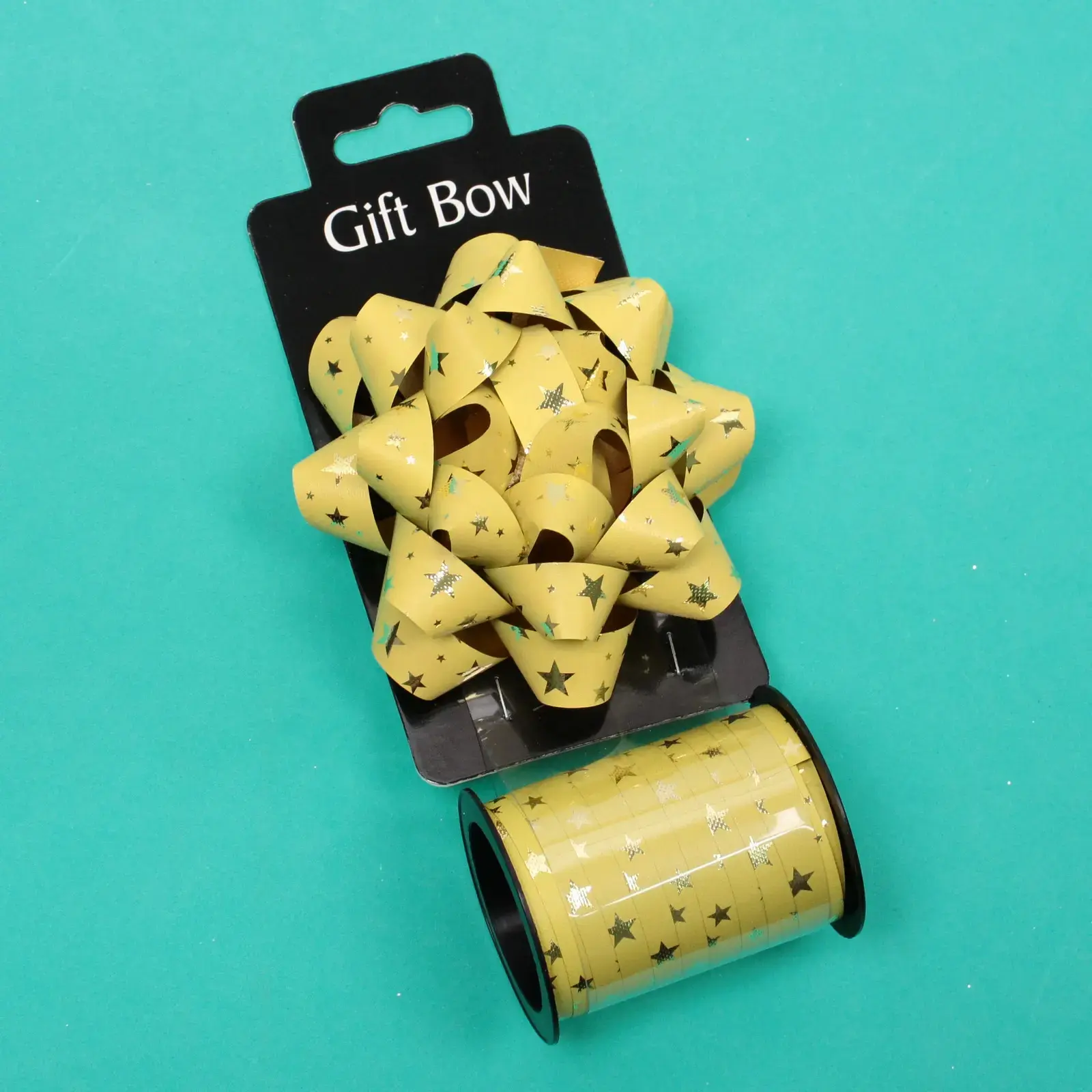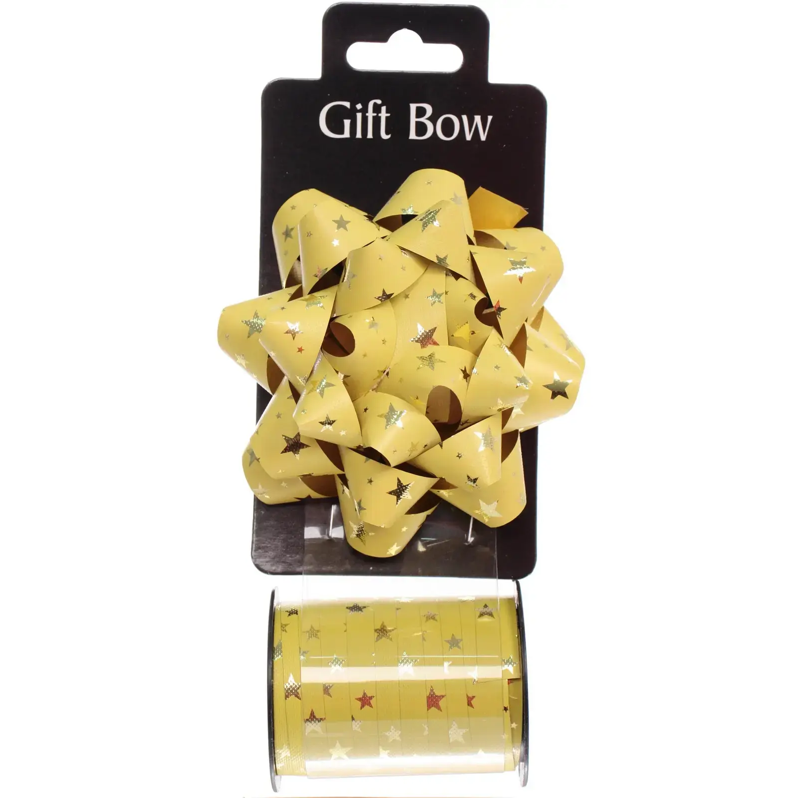 Размер банта составляет 10 см в диаметре, а длина рулона ленты — 10 метров. Ширина ленты — 1,6 см. Эти размеры позволяют использовать набор для упаковки как небольших, так и крупных подарков. Набор представлен в ярком золотом цвете, который отлично сочетается с любыми упаковочными материалами.