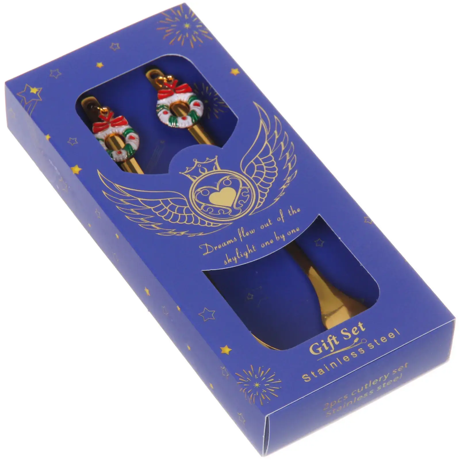 Набор упакован в стильную подарочную коробку синего цвета с золотыми звёздами и надписью «Gift Set». Размеры столовых приборов стандартные, что делает их универсальными для любого стола. Подарите себе и своим близким возможность наслаждаться десертами с изяществом и комфортом!