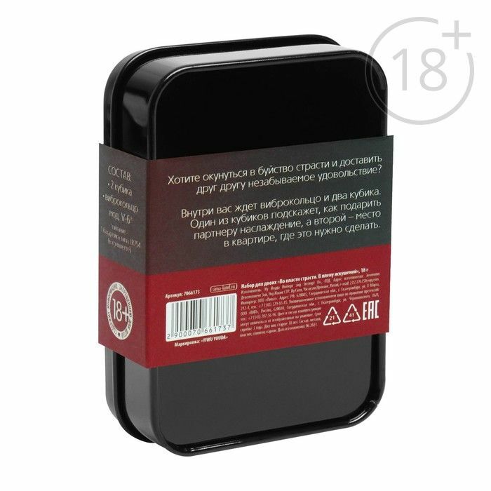 Цвет набора - черный с белым, что придает ему стильный и элегантный вид. Виброкольцо выполнено из качественных материалов и обеспечивает комфортное использование. В комплекте также есть батарейки, так что вы сможете сразу же начать свои приключения. Набор упакован в стильную жестяную коробочку, что делает его отличным подарком для особого случая.