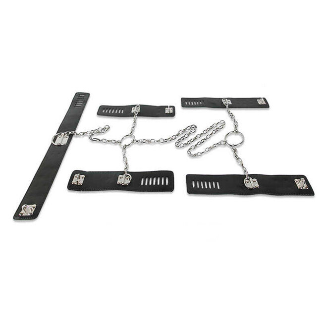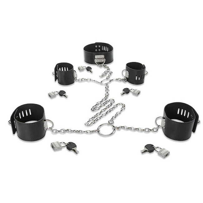 Набор включает 4 элемента: наручники для запястий (24 см), наножники (28.5 см), ошейник (44 см) и соединительные цепи. 5 замков с индивидуальными ключами обеспечивают контроль доступа.