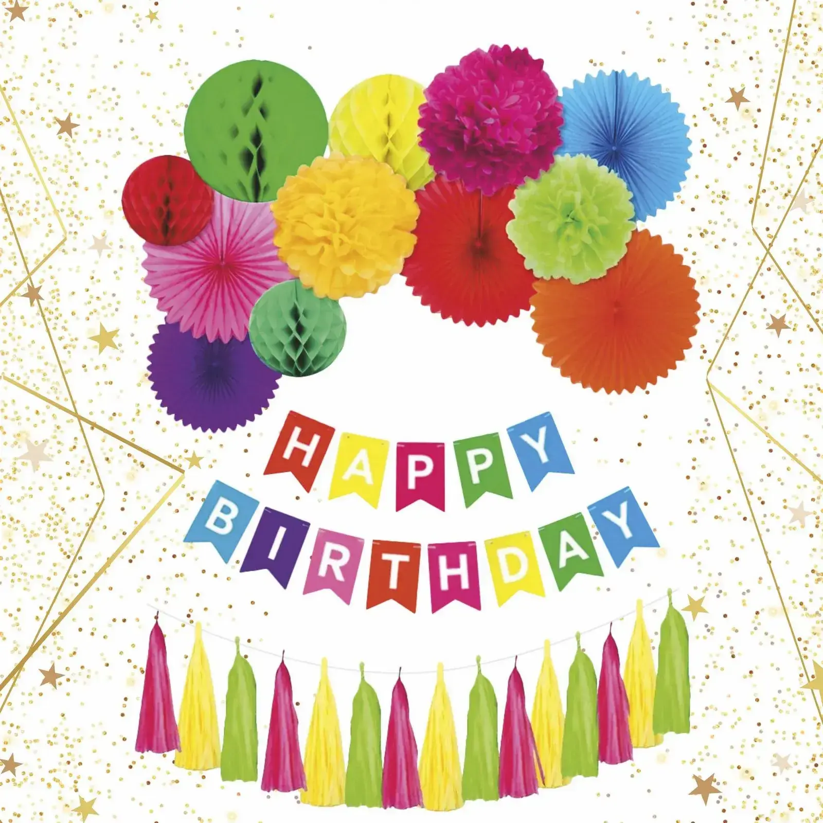 Набор подходит для оформления различных праздников, включая дни рождения, юбилеи и другие торжества. Просто развесьте декоративные элементы в помещении или на улице, создавая эффектный фон для фотографий. Используйте скотч, веревку и скрепки, которые также входят в комплект, для удобного крепления элементов.