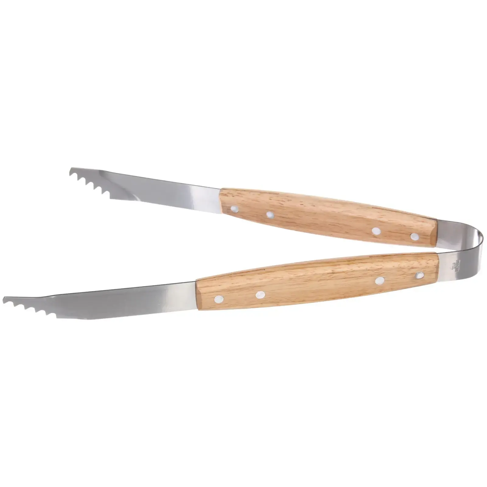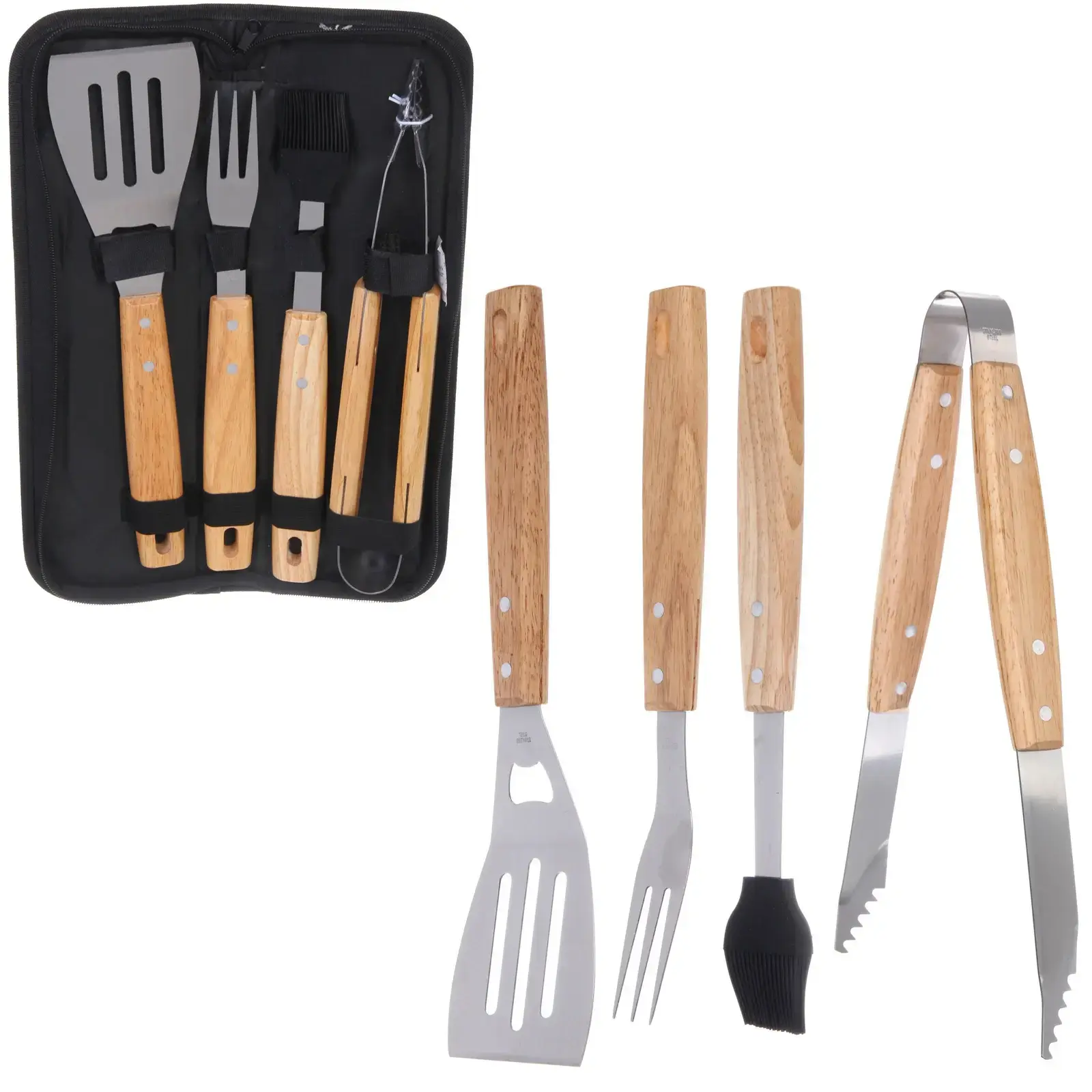 Все инструменты имеют удобные ручки из дерева светлого цвета, что обеспечивает надежный хват и комфорт в использовании. Набор упакован в черный текстильный чехол на молнии, который удобно носить с собой. Размеры и форма инструментов варьируются, что позволяет использовать их для различных кулинарных задач. Этот набор станет отличным подарком для всех любителей гриля и барбекю!