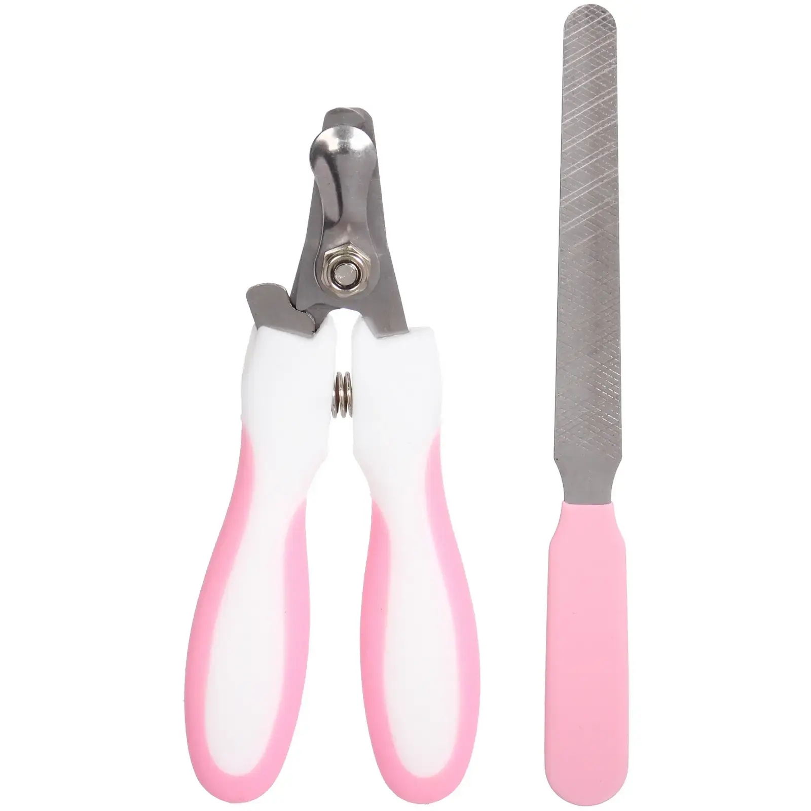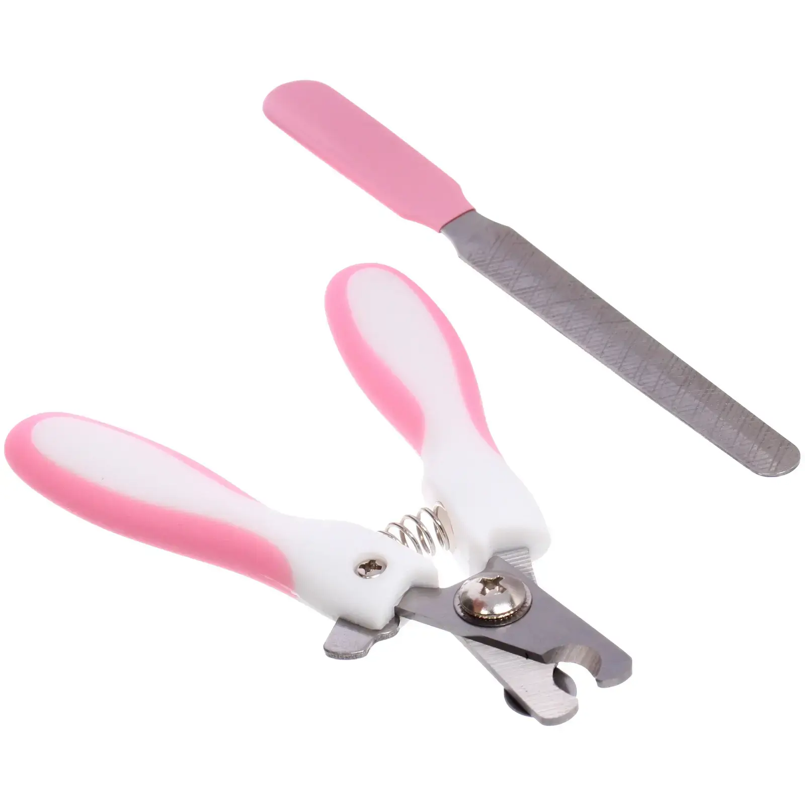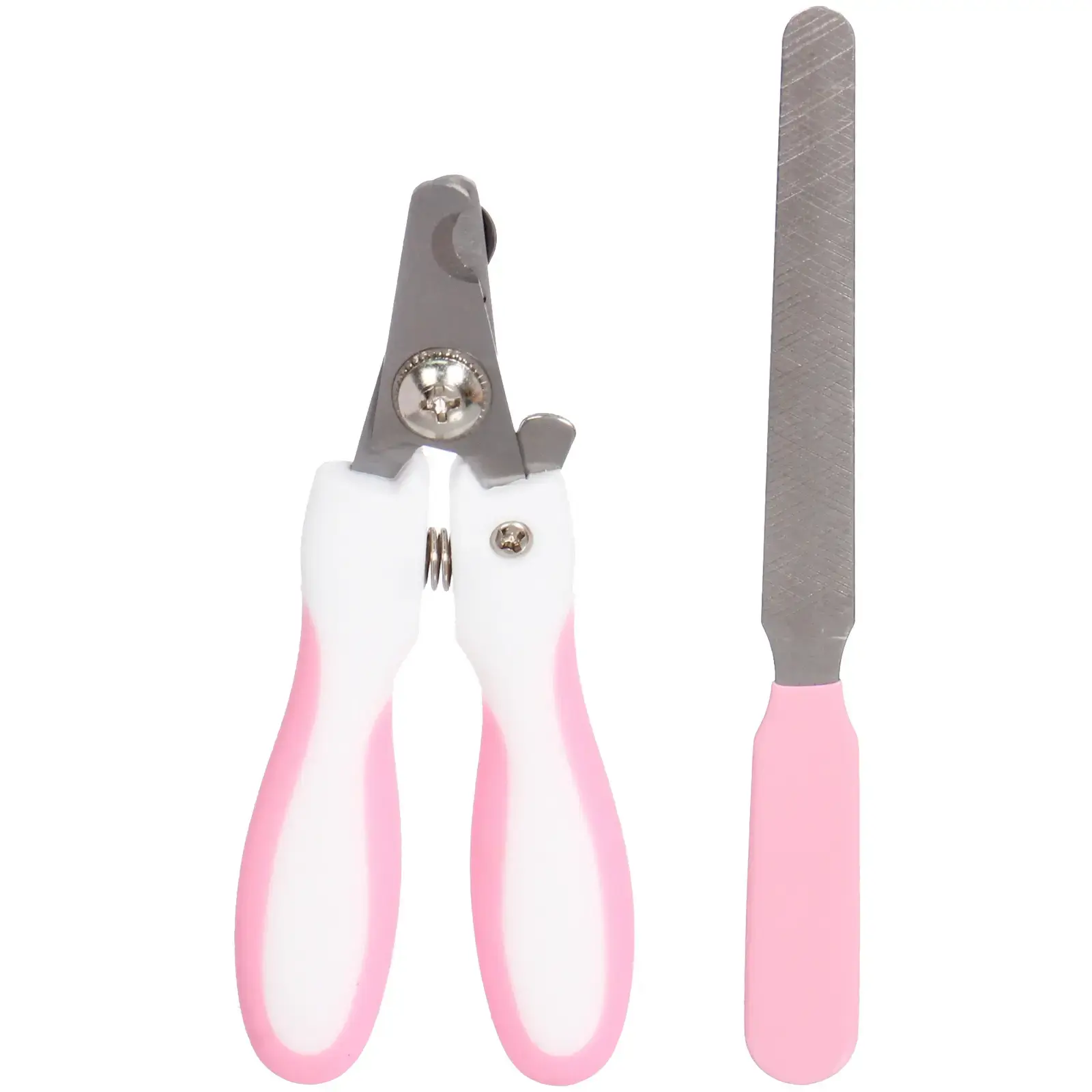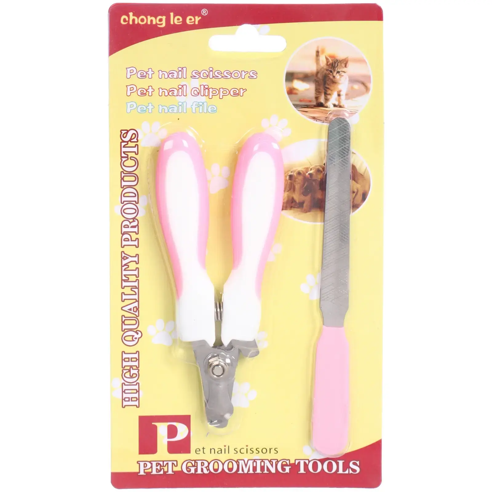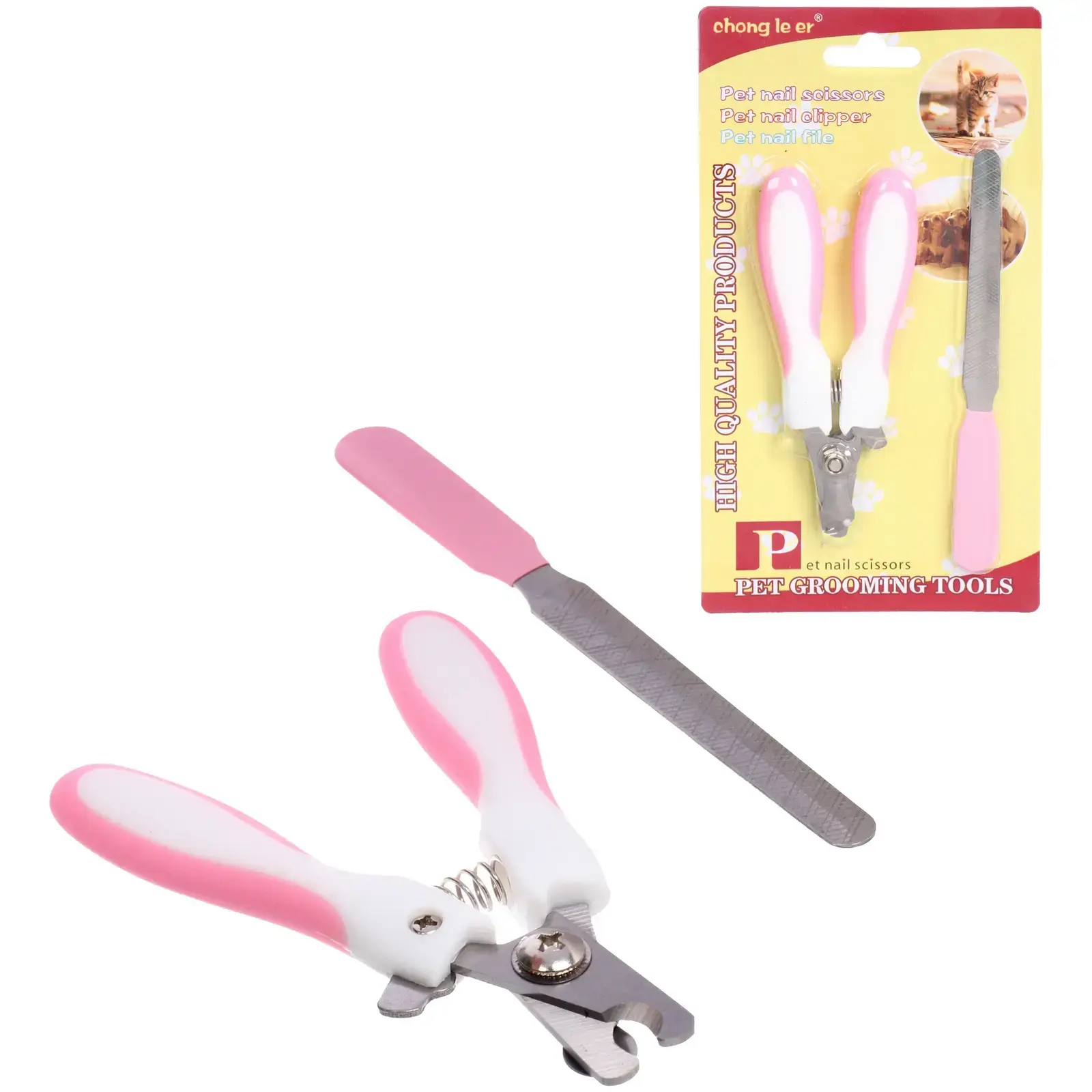 Когтерез и пилка имеют бело-розовую расцветку, что делает их стильными и привлекательными. Размеры инструментов компактные, что позволяет удобно хранить их в любом месте. Набор упакован в яркую упаковку, что делает его отличным подарком для любителей домашних животных.